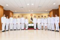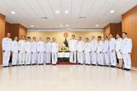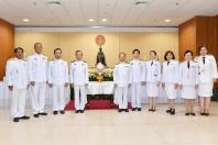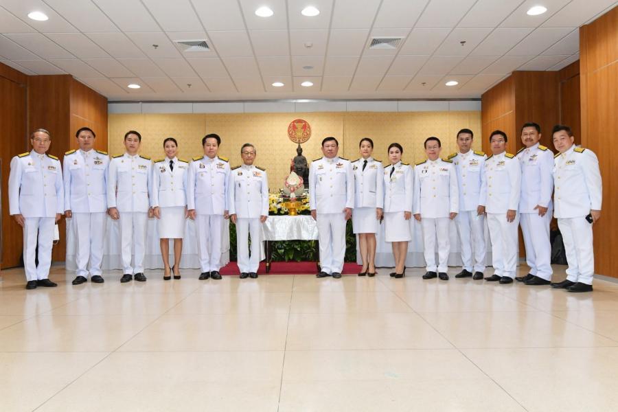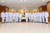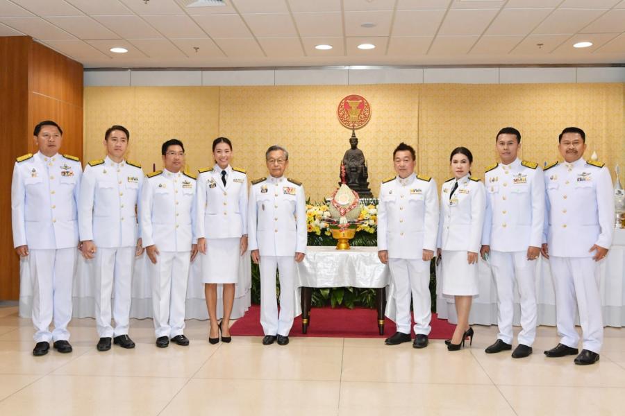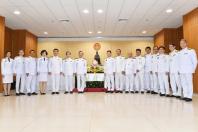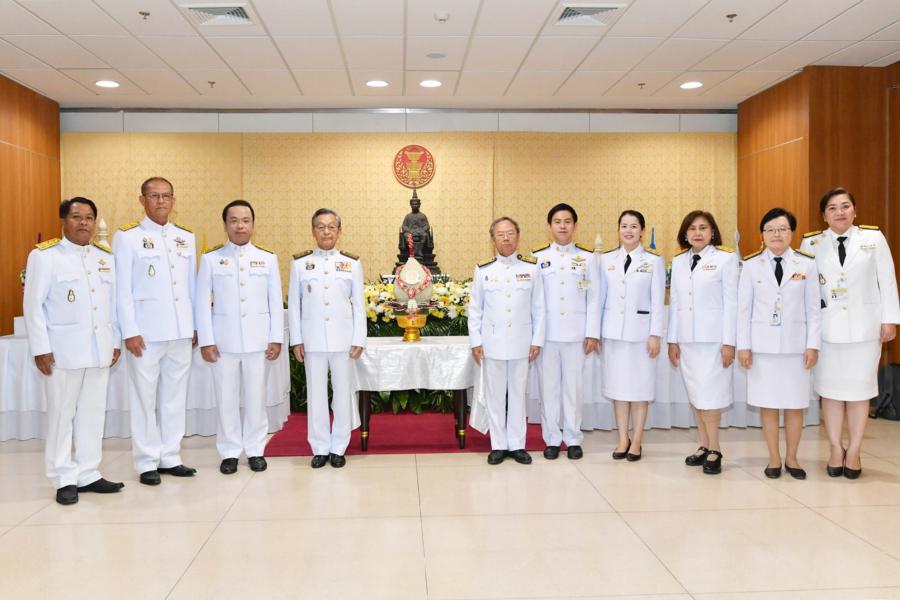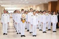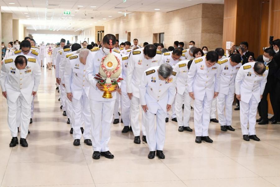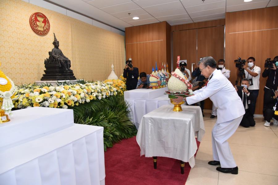 วางพานประดับพุ่มดอกไม้ถวายบังคมพระรูปต้นแบบพระบาทสมเด็จพระปกเกล้าเจ้าอยู่หัว ในนาม