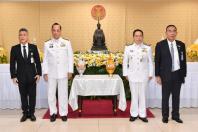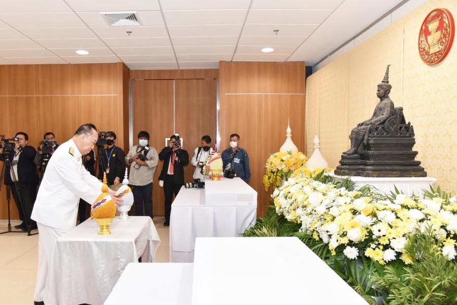 วางพานประดับพุ่มดอกไม้ถวายบังคมพระรูปต้นแบบพระบาทสมเด็จพระปกเกล้าเจ้าอยู่หัว ในนาม