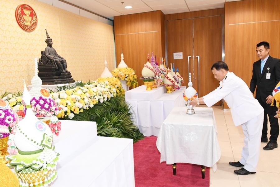 ศ.โกวิทย์ พวงงาม สมาชิกสภาผู้แทนราษฎรพรรคพลังท้องถิ่นไทย วางพานประดับพุ่มดอกไม้ถวายบังคม