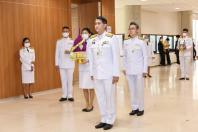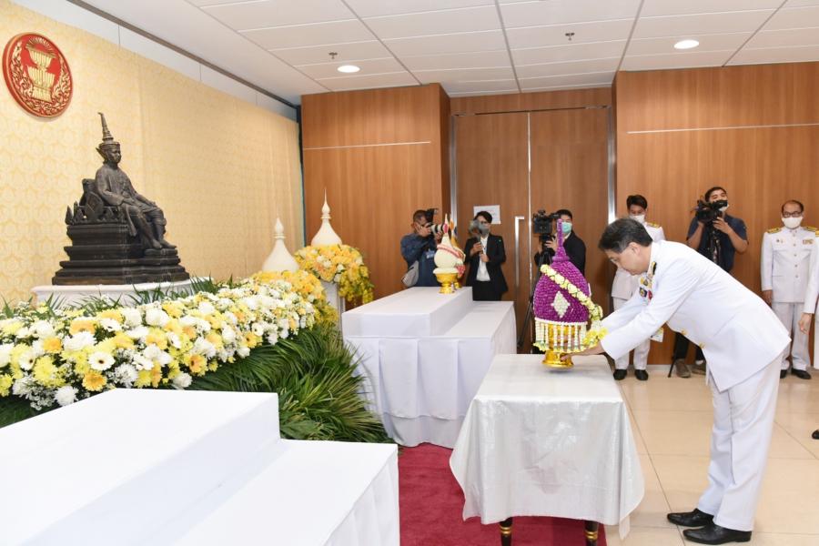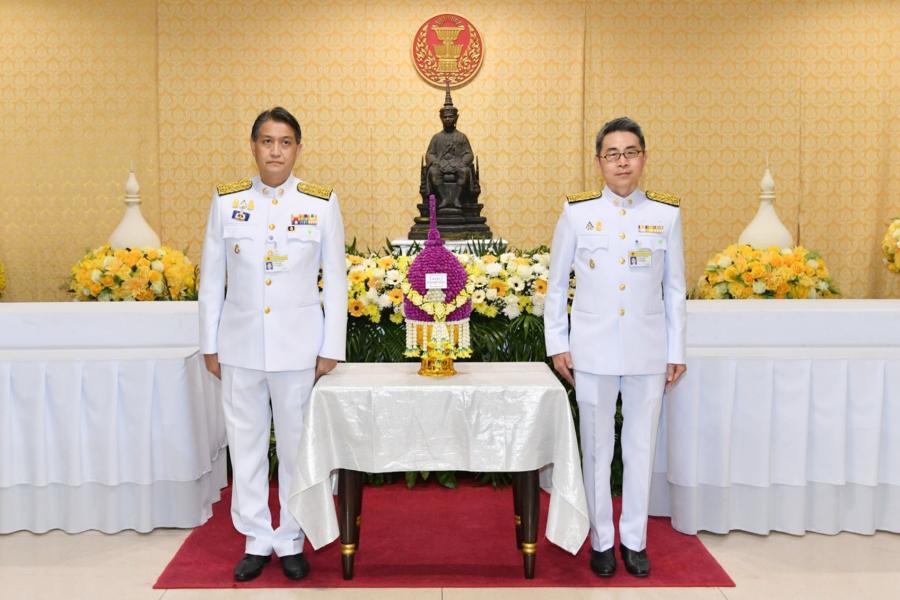 วางพานประดับพุ่มดอกไม้ถวายบังคมพระรูปต้นแบบพระบาทสมเด็จพระปกเกล้าเจ้าอยู่หัว ในนาม