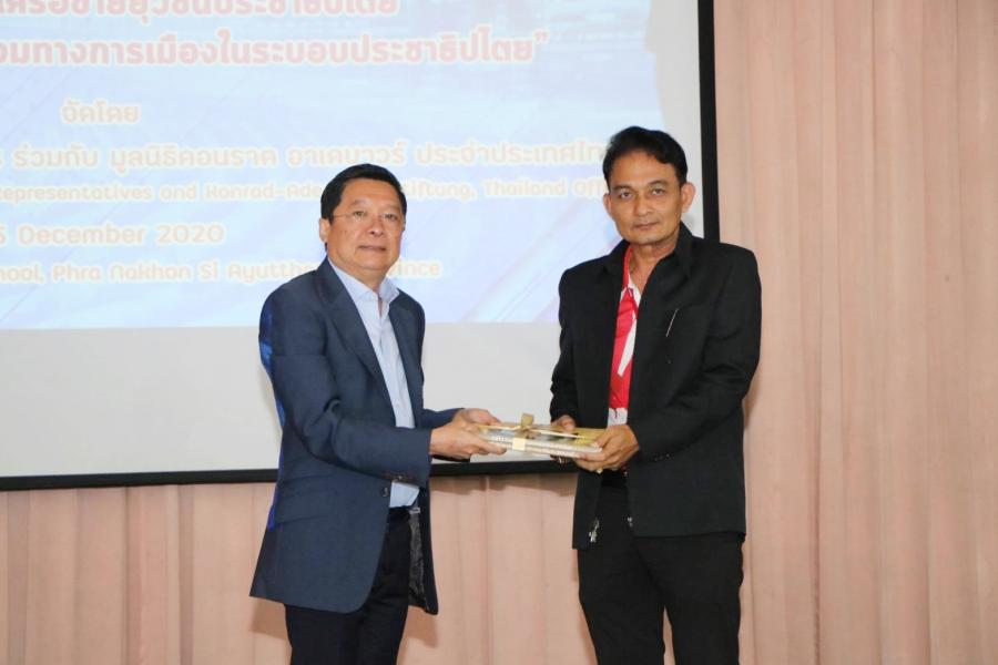 จากนั้น นายเกื้อกูล ได้มอบของที่ระลึกแก่ผู้แทนโรงเรียนอยุธยานุสรณ์