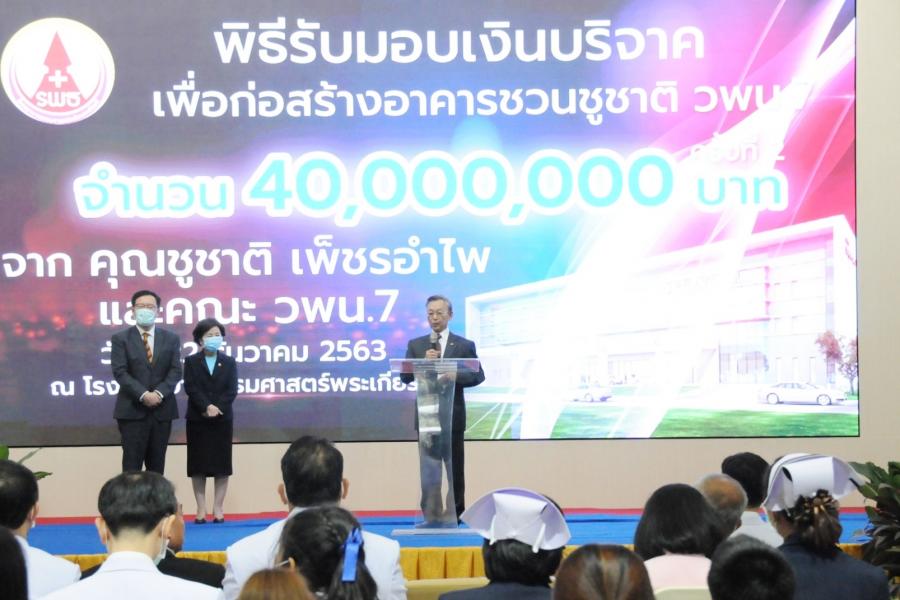 ประธานรัฐสภา ร่วมพิธีรับมอบเงินบริจาคจาก นายชูชาติ เพ็ชรอำไพ และคณะ วพน. ๗ จำนวน ๔๐ ล้านบาท (ครั้งที่ ๒) ให้แก่ อธิการบดีมหาวิทยาลัยธรรมศาสตร์และกรรมการสภามหาวิทยาลัย ธรรมศาสตร์ เพื่อใช้ในการก่อสร้างอาคารชวนชูชาติ วพน. ๗