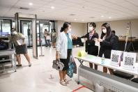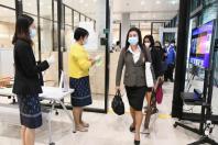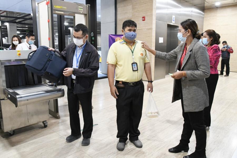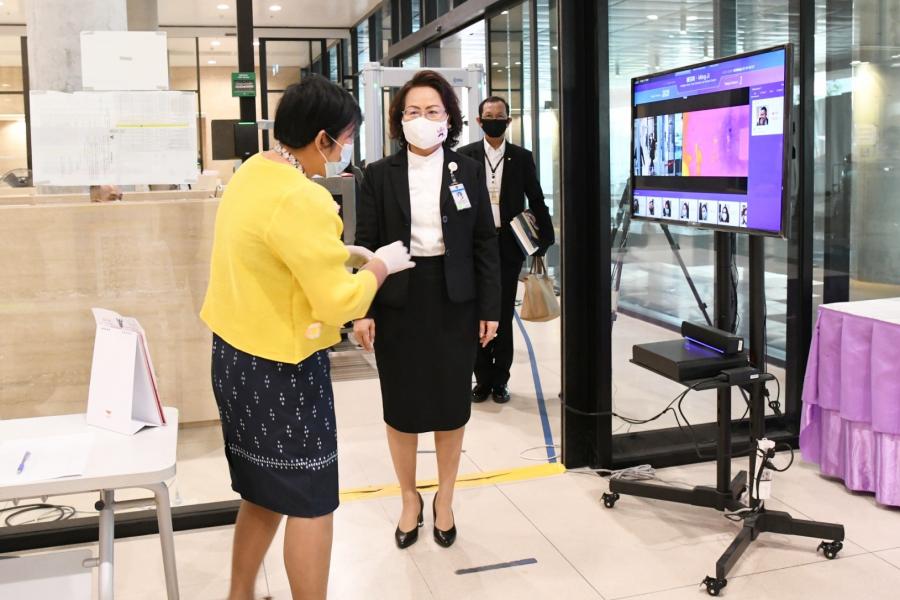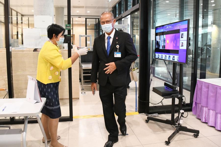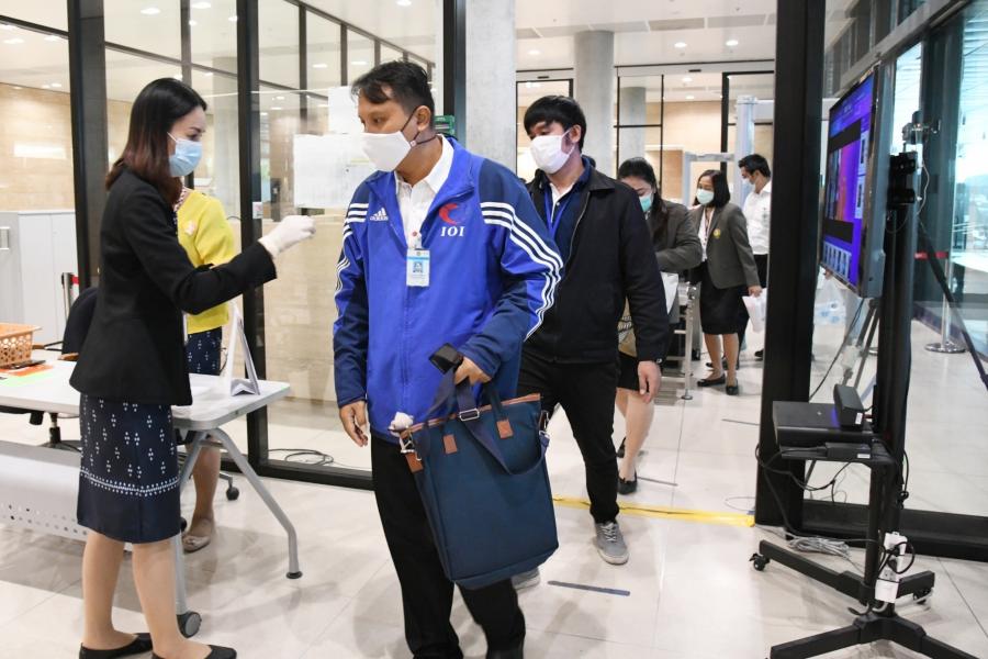 ตรวจวัดอุณหภูมิร่างกายก่อนเข้าภายในอาคารรัฐสภา ซึ่งเป็นไปตามแนวปฏิบัติเพื่อป้องกันการแพร่ระบาดของเชื้อไวรัสโคโรนา ๒๐๑๙ หรือโรคโควิด-๑๙ ณ อาคารรัฐสภา เกียกกาย ของสำนักงานเลขาธิการสภาผู้แทนราษฎร