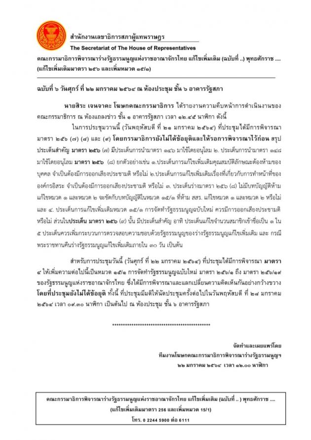 วันศุกร์ที่ ๒๒ มกราคม ๒๕๖๔ เวลา ๑๒.๔๕ นาฬิกา ณ ห้องแถลงข่าว ชั้น ๑ อาคารรัฐสภา นายสิระ เจนจาคะ โฆษกคณะ กมธ. พิจารณาร่างรัฐธรรมนูญแห่งราชอาณาจักรไทย แก้ไขเพิ่มเติม ฉบับที่ ..)พุทธศักราช .... (แก้ไขเพิ่มเติมมาตรา ๒๕๖ และเพิ่มหมวด ๑๕/๑) แถลงข่าวความคืบหน้าการพิจารณาของคณะ กมธ. ว่า เมื่อวันพฤหัสบดีที่ ๒๑ ม.ค. ๖๔ ที่ประชุมได้พิจารณามาตรา ๒๕๖ (๗) (๘) และ (๙) แต่ยังไม่ได้ข้อยุติและให้รอการพิจารณาไว้ก่อน สำหรับในวันนี้ (๒๒ ม.ค. ๖๔) มีการพิจารณามาตรา ๔ ซึ่งได้มีการแลกเปลี่ยนความคิดเห็นกันอย่างกว้างขวางและยังไม่ได้ข้อยุติ