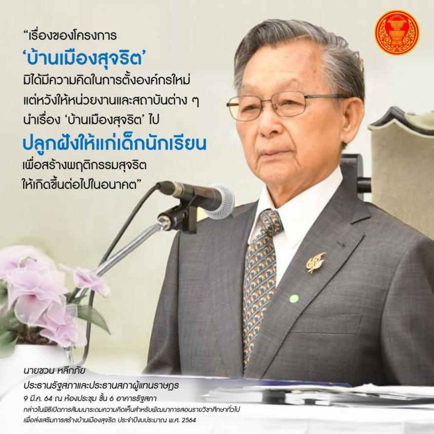 ประธานรัฐสภาและประธานสภาผู้แทนราษฎร กล่าวในพิธีเปิดการสัมมนา ระดมความคิดเห็นสำหรับพัฒนาการสอนรายวิชาศึกษาทั่วไป เพื่อส่งเสริมการสร้างบ้านเมืองสุจริต ประจำปีงบประมาณ 2564