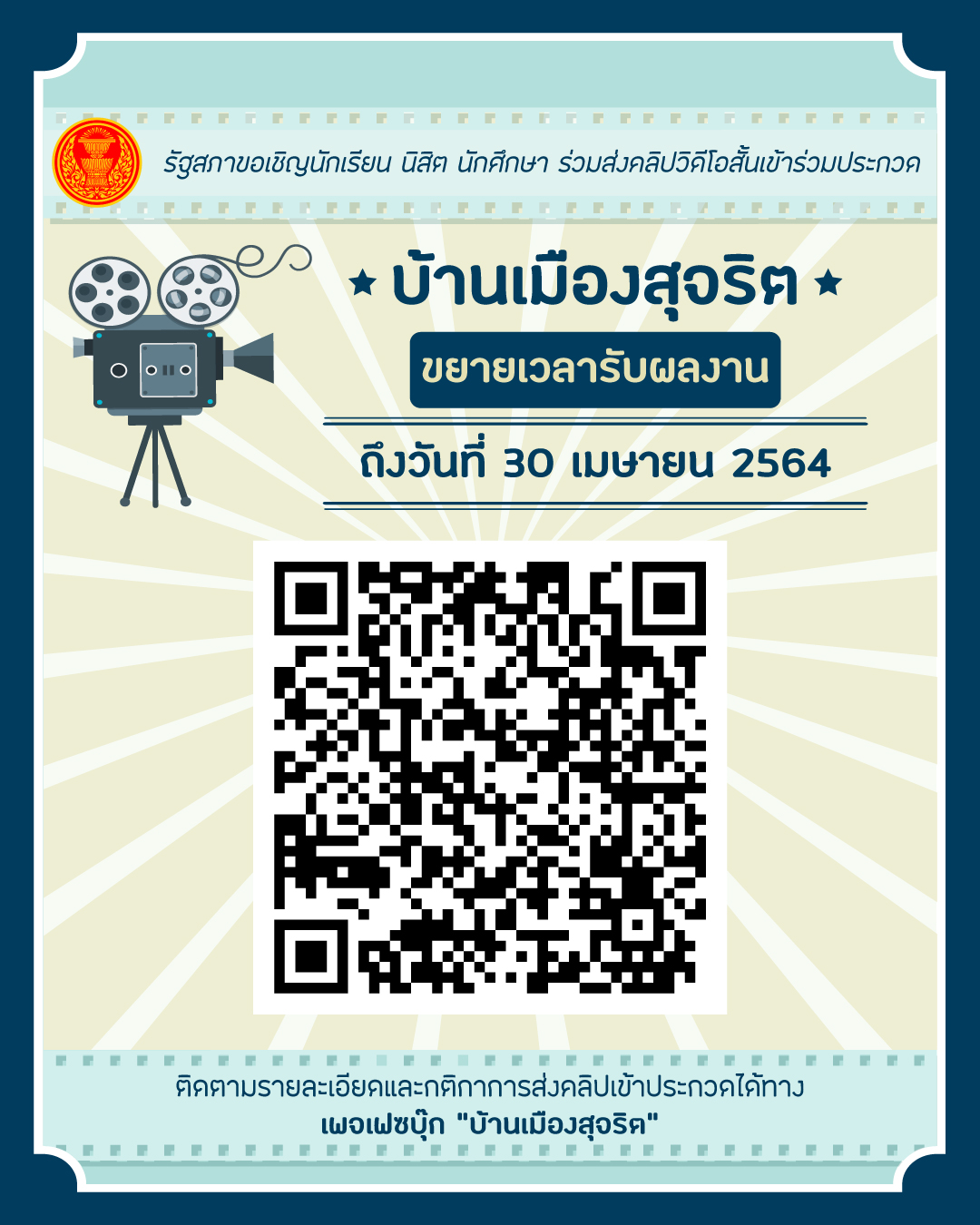 ขอเชิญ นักเรียน นิสิต นักศึกษา ส่งคลิปวิดีโอสั้นเข้าประกวด "บ้านเมืองสุจริต" ขยายเวลารับผลงาน ถึง ๓๐ เม.ย. ๖๔