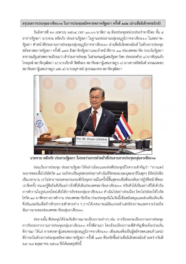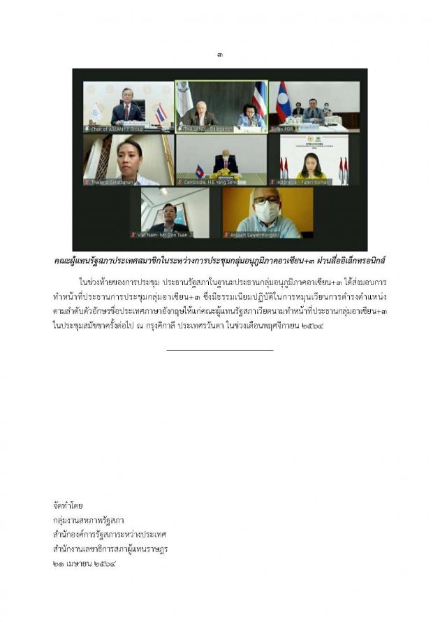 จากนั้น ที่ประชุมได้ร่วมกันพิจารณาระเบียบวาระต่างๆ เช่น การรับรองระเบียบวาระการประชุม การรับรองรายงานการประชุมกลุ่มอาเซียน+3 ครั้งที่ผ่านมา โดยมีระเบียบวาระที่สำคัญที่จะต้องร่วมกันพิจารณา ได้แก่ การสรรหาผู้แทนของกลุ่มอนุภูมิภาคอาเซียน+3 เพื่อเสนอชื่อเป็นผู้สมัครทดแทนตำแหน่งที่ว่างลงในห้วงการประชุมสมัชชาสหภาพรัฐสภา ครั้งที่ 142 ที่จะจัดขึ้นผ่านสื่ออิเล็กทรอนิกส์ ระหว่างวันที่ 24- 27 พ.ค. 64 (รายละเอียดสรุปผลการประชุมตามแนบ)