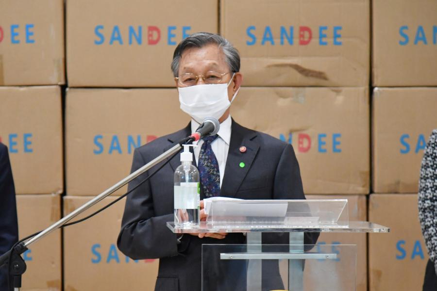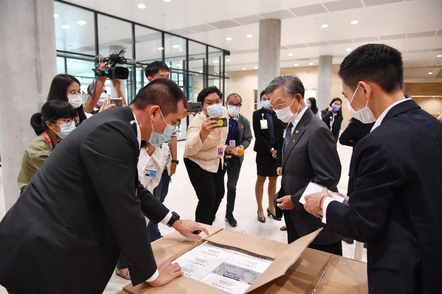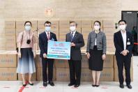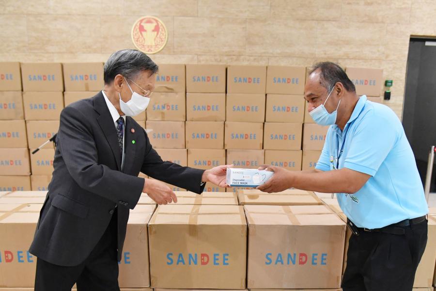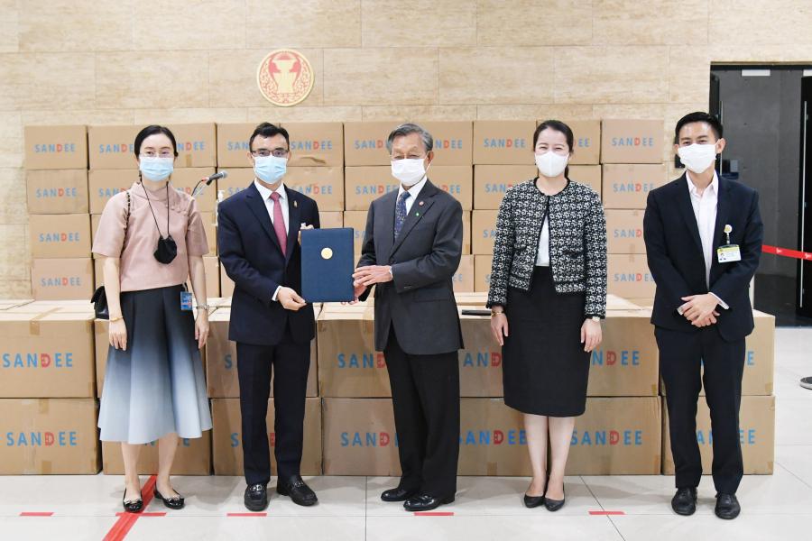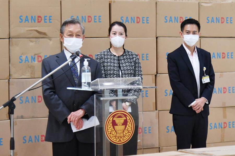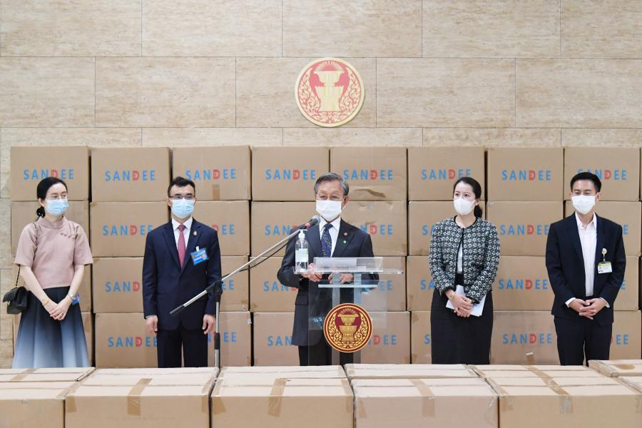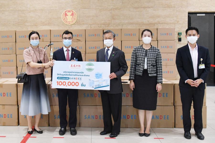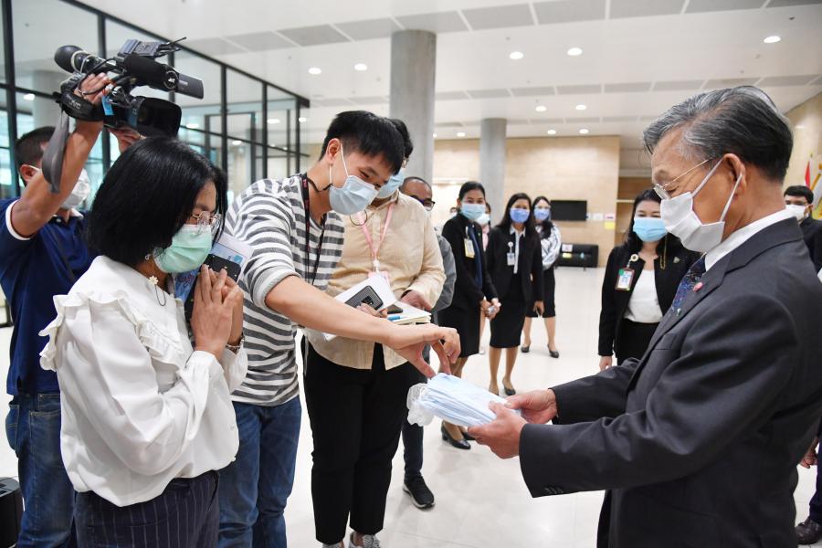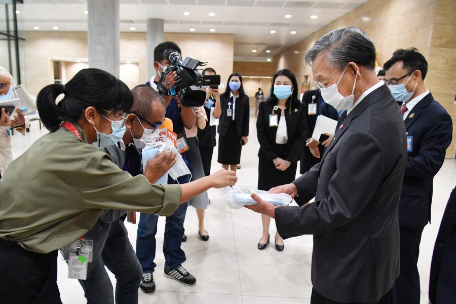 ประธานรัฐสภา ในฐานะประธานมูลนิธิเพื่อสังคมและการศึกษา รับมอบหน้ากากอนามัย จำนวน 200,000 ชิ้น จากนายธัชพล บวรวัชรวงศ์ และ น.ส.จิรภา บุญสวัสดิ์ ผู้แทนจากหนังสือพิมพ์ซิงเสียนเยอะเป้า บริษัท ออโรร่า ซักเซส จำกัด และบริษัท CBS Shoes