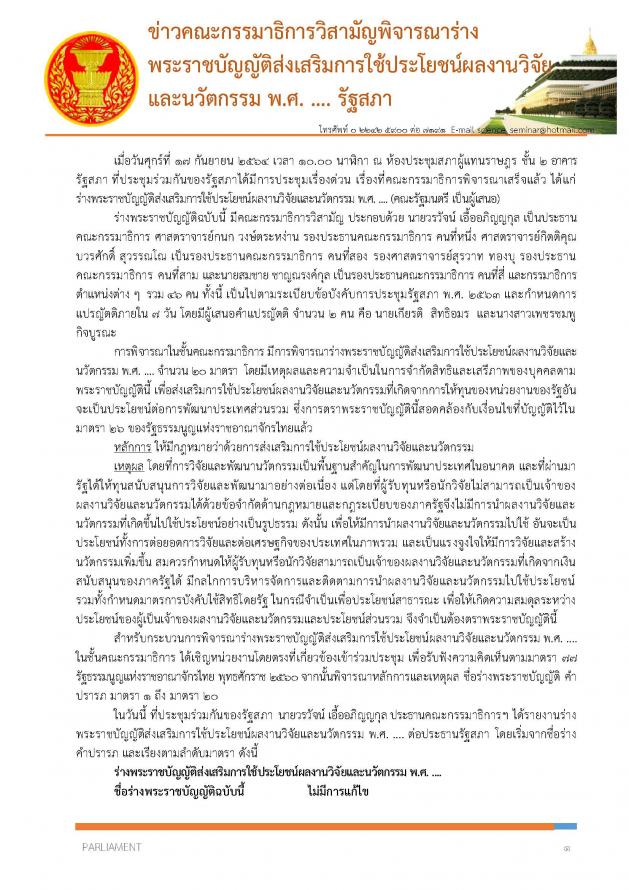 วันศุกร์ที่ 17 กันยายน 2564 เวลา 10.50 นาฬิกา ณ ห้องแถลงข่าว ชั้น 1 อาคารรัฐสภา นายวรวัจน์ เอื้ออภิญญกุล ประธานคณะ กมธ.วิสามัญพิจารณาร่าง พ.ร.บ.ส่งเสริมการใช้ประโยชน์ผลงานวิจัยและนวัตกรรม พ.ศ. .... พร้อมด้วย นายอัครวัฒน์ อัศวเหม ประธานคณะกมธ. การวิทยาศาสตร์ เทคโนโลยี วิจัยและนวัตกรรม และที่ปรึกษาคณะ กมธ.วิสามัญฯ ศ.กนก วงษ์ตระหง่าน รองประธานคณะ กมธ.วิสามัญฯ คนที่หนึ่ง นายพิเชษฐ์ เชื้อเมืองพาน ที่ปรึกษาคณะ กมธ.วิสามัญฯ น.ส.พิมพ์รพี พันธุ์วิชาติกุล โฆษกคณะ กมธ.วิสามัญฯ และน.ส.ผ่องศรี ธาราภูมิ เลขานุการคณะ กมธ.วิสามัญฯ แถลงข่าวภายหลังจากที่ที่ประชุมร่วมกันของรัฐสภา มีมติเห็นชอบร่าง พ.ร.บ.ส่งเสริมการใช้ประโยชน์ผลงานวิจัยและนวัตกรรม พ.ศ. .... ด้วยคะแนน 494 เสียง โดยขอขอบคุณสมาชิกรัฐสภาที่ได้ให้การสนับสนุนร่าง พ.ร.บ.ดังกล่าว ซึ่งจะส่งผลให้มีการนำผลงานวิจัยและนวัตกรรมไปใช้ อันจะเป็นประโยชน์ทั้งการต่อยอดการวิจัยและต่อเศรษฐกิจของประเทศในภาพรวม รวมทั้งเป็นแรงจูงใจให้มีการวิจัยและสร้างนวัตกรรมเพิ่มขึ้น ผู้รับทุนหรือนักวิจัยสามารถเป็นเจ้าของผลงานวิจัยและนวัตกรรมที่เกิดจากเงินสนับสนุนของภาครัฐได้ มีกลไกในการบริหารจัดการและติดตามการนำผลงานวิจัยและนวัตกรรมไปใช้ประโยชน์ ตลอดจนกำหนดมาตรการบังคับใช้สิทธิโดยรัฐในกรณีจำเป็นเพื่อประโยชน์สาธารณะ เพื่อให้เกิดความสมดุลระหว่างประโยชน์ของผู้เป็นเจ้าของผลงานวิจัยและนวัตกรรมกับประโยชน์ส่วนรวมต่อไป