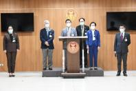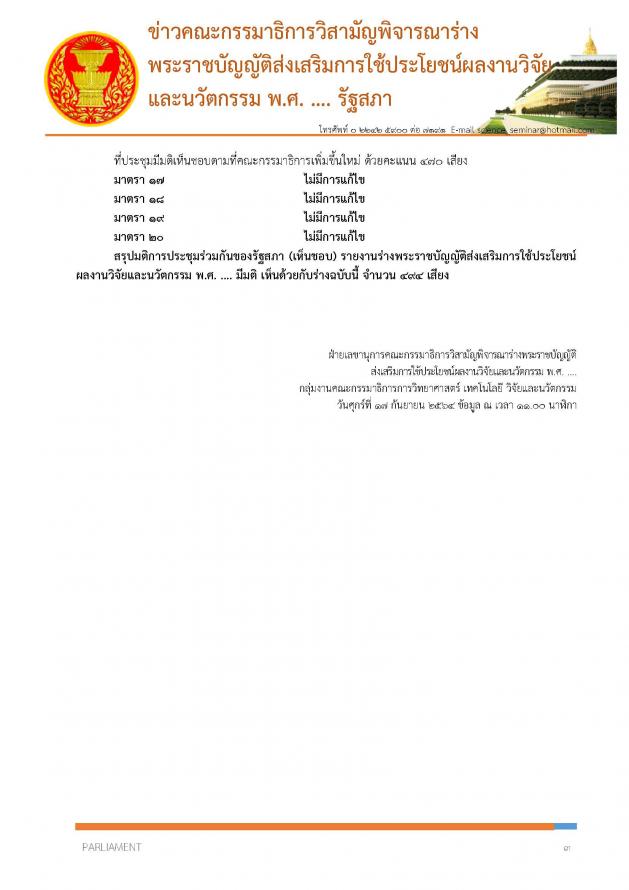 ประธานคณะ กมธ.วิสามัญพิจารณาร่าง พ.ร.บ.ส่งเสริมการใช้ประโยชน์ผลงานวิจัยและนวัตกรรม พ.ศ. .... พร้อมด้วย ประธานคณะกมธ. การวิทยาศาสตร์ เทคโนโลยี วิจัยและนวัตกรรม และคณะ แถลงข่าวภายหลังจากที่ที่ประชุมร่วมกันของรัฐสภา มีมติเห็นชอบร่าง พ.ร.บ.ส่งเสริมการใช้ประโยชน์ผลงานวิจัยและนวัตกรรม พ.ศ. ....