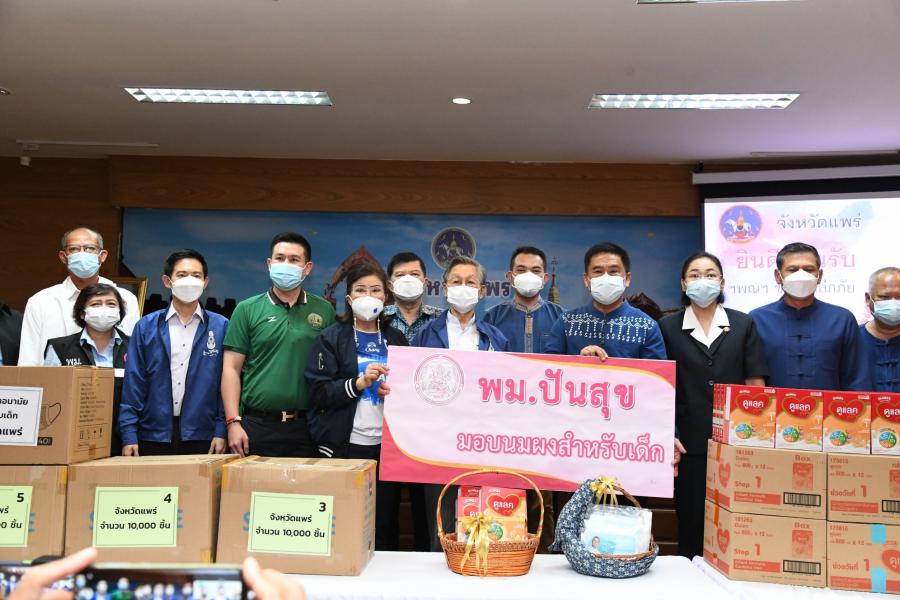 | วันศุกร์ที่ 24 กันยายน 2564 เวลา 12.30 นาฬิกา ณ ศาลากลาง จ.แพร่ นายชวน หลีกภัย ประธานรัฐสภา และประธานมูลนิธิเพื่อสังคมและการศึกษา พร้อมด้วย นายอิสระ เสรีวัฒนวุฒิ สมาชิกสภาผู้แทนราษฎร ในฐานะเลขานุการมูลนิธิฯ นางศิริวรรณ ปราศจากศัตรู สมาชิกสภาผู้แทนราษฎร นางพัชรี อาระยะกุล ปลัดกระทรวงการพัฒนาสังคมและความมั่นคงของมนุษย์ นายสมบูรณ์ อุทัยเวียนกุล เลขานุการประธานสภาผู้แทนราษฎร และคณะผู้บริหารกระทรวงการพัฒนาสังคมและความมั่นคงของมนุษย์ เดินทางไปมอบหน้ากากอนามัย จำนวน 10,000 ชิ้น หน้ากากอนามัยสำหรับเด็ก จำนวน 2,000 ชิ้น และนมผงสำหรับเด็ก ผ่านผู้ว่าราชการจังหวัดและสำนักงานพัฒนาสังคมและความมั่นคงของมนุษย์จังหวัดแพร่ เพื่อจัดสรรให้แก่ประชาชนกลุ่มเปราะบางในจังหวัด สำหรับใช้ในการป้องกันโรคติดเชื้อไวรัสโคโรนา2019 (โควิด-19) ในการนี้ นายนิยม วิวรรธนดิฐกุล สมาชิกสภาผู้แทนราษฎร พร้อมด้วย นายเอกการ ซื่อทรงธรรม และนายกฤติดนัย สันแก้ว สมาชิกสภาผู้แทนราษฎรจังหวัดแพร่ ร่วมให้การต้อนรับ โดยมี นายสมหวัง พ่วงบางโพ ผู้ว่าราชการ จังหวัดแพร่ และสำนักงานพัฒนาสังคมและความมั่นคงของมนุษย์จังหวัดแพร่ เป็นผู้รับมอบ