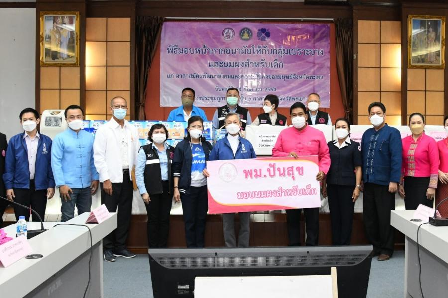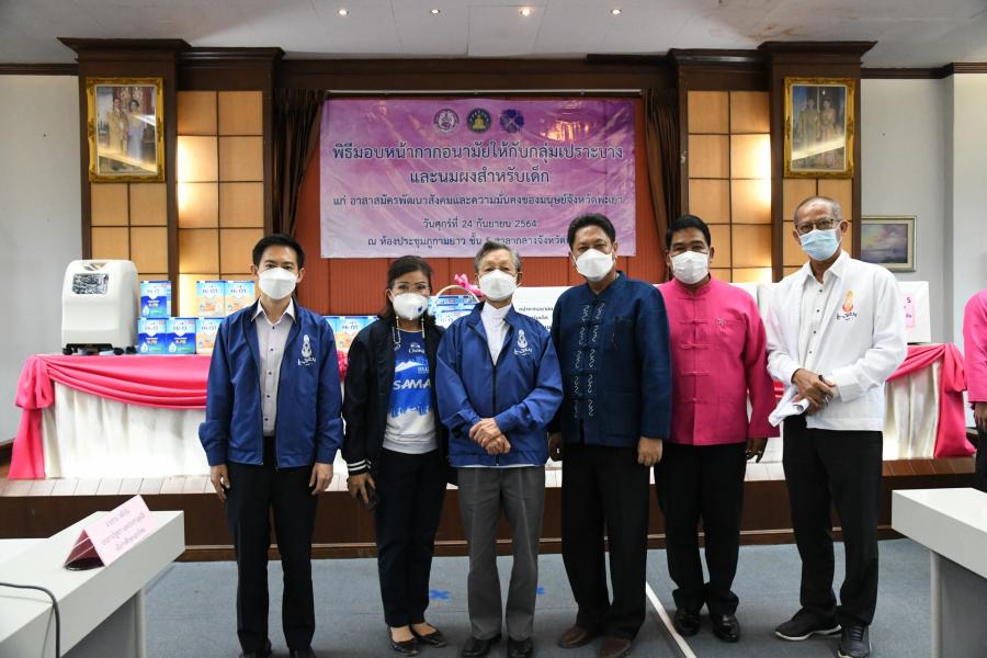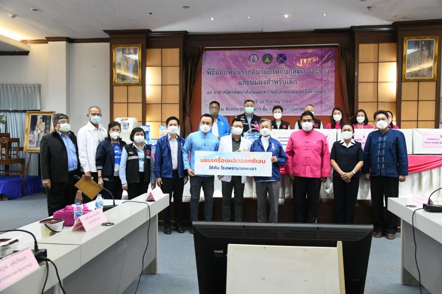 | วันศุกร์ที่ 24 กันยายน 2564 เวลา 16.30 นาฬิกา ณ ศาลากลาง จ.พะเยา นายชวน หลีกภัย ประธานรัฐสภา และประธานมูลนิธิเพื่อสังคมและการศึกษา พร้อมด้วย นายอิสระ เสรีวัฒนวุฒิ สมาชิกสภาผู้แทนราษฎร ในฐานะเลขานุการมูลนิธิฯ นางศิริวรรณ ปราศจากศัตรู สมาชิกสภาผู้แทนราษฎร นางพัชรี อาระยะกุล ปลัดกระทรวงการพัฒนาสังคมและความมั่นคงของมนุษย์ นายสมบูรณ์ อุทัยเวียนกุล เลขานุการประธานสภาผู้แทนราษฎร และคณะผู้บริหารกระทรวงการพัฒนาสังคมและความมั่นคงของมนุษย์ เดินทางไปมอบหน้ากากอนามัย จำนวน 10,000 ชิ้น หน้ากากอนามัยสำหรับเด็ก จำนวน 2,000 ชิ้น และนมผงสำหรับเด็ก ผ่านผู้ว่าราชการจังหวัดและสำนักงานพัฒนาสังคมและความมั่นคงของมนุษย์จังหวัดพะเยา เพื่อจัดสรรให้แก่ประชาชนกลุ่มเปราะบางในจังหวัด สำหรับใช้ในการป้องกันโรคติดเชื้อไวรัสโคโรนา 2019 (โควิด-19) ในการนี้ นายวิสุทธิ์ ไชยณรุณ สมาชิกสภาผู้แทนราษฎร จังหวัดพะเยา ร่วมให้การต้อนรับ โดยมี นายโชคดี อมรวัฒน์ ผู้ว่าราชการจังหวัดพะเยา และสำนักงานพัฒนาสังคมและความมั่นคงของมนุษย์จังหวัดพะเยา เป็นผู้รับมอบ จากนั้น นายชวน หลีกภัย รับมอบเครื่องผลิตออกซิเจน จาก นายอนุพงษ์ มาคำ กรรมการผู้จัดการ บริษัท บลูสกายแชนแนล จำกัด เพื่อส่งมอบให้กับโรงพยาบาลพะเยา สำหรับนำไปใช้ประโยชน์ในการดูแลผู้ป่วยช่วงวิกฤตโควิด-19