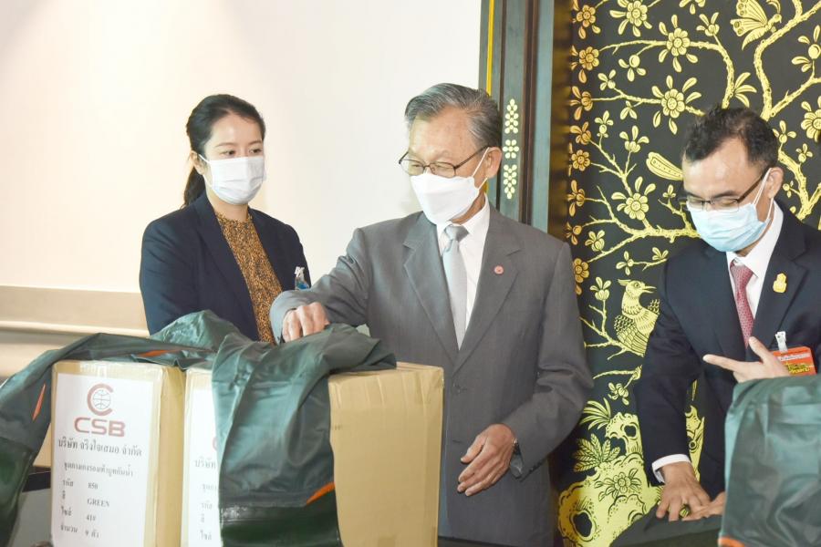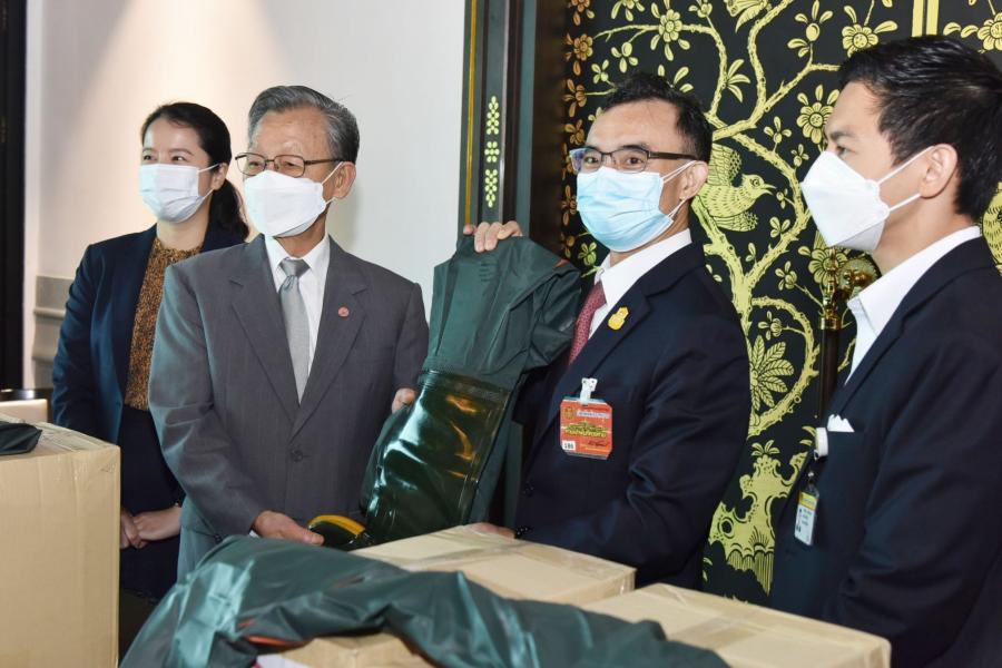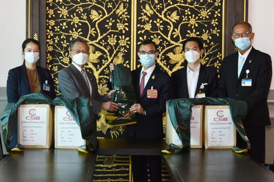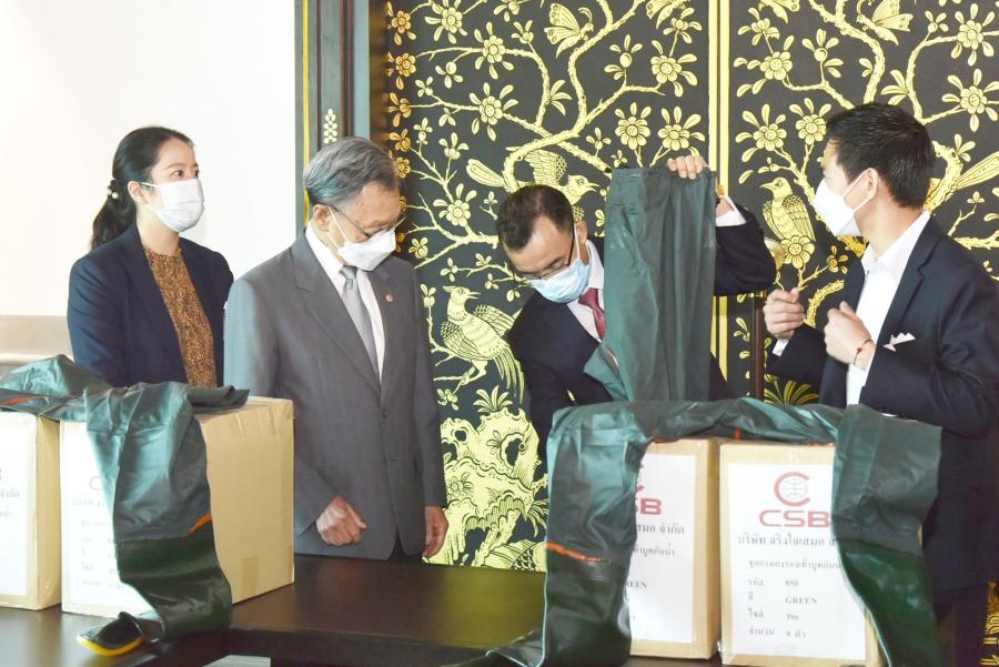 ประธานรัฐสภาและประธานสภาผู้แทนราษฎร รับมอบชุดกางเกงรองเท้าบูทกันน้ำ จำนวน 504 ชุด จากนายชาน ลอง อิม ประธานกรรมการบริษัท CSB Shoes และบริษัท จริงใจเสมอ จำกัด