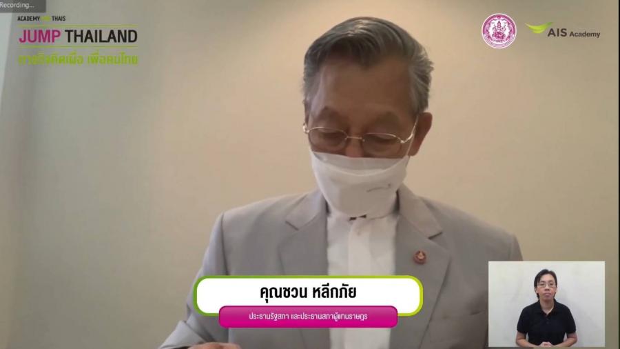 วันเสาร์ที่ 16 ตุลาคม 2564 เวลา 10.00 นาฬิกา ณ ห้องทำงานพรรคประชาธิปัตย์ นายชวน หลีกภัย ประธานรัฐสภา และประธานสภาผู้แทนราษฎร เป็นประธานในพิธีเปิดงาน "ภารกิจคิดเผื่อเพื่อคนไทย JUMP THAILAND" และปาฐกถาพิเศษ หัวข้อ "การเป็นพลเมืองที่ดี เพื่อพาประเทศไทย ก้าวกระโดดสู่การพัฒนาที่ยั่งยืน” ผ่านสื่ออิเล็กทรอนิกส์  จัดโดยกระทรวงการพัฒนาสังคมและและความมั่นคงของมนุษย์ ร่วมกับ AIS Academy และบริษัทเลิร์นดิ จำกัด โดยมีวัตถุประสงค์ เพื่อเชื่อมโยงและบูรณาการโครงการ JUMP  THAILAND กับการเป็นคนดีของสังคมไทย ตามแนวพระราชดำรัสของพระบาทสมเด็จพระบรมชนกาธิเบศร มหาภูมิพลอดุลยเดชมหาราช บรมนาถบพิตร สืบสาน รักษา และต่อยอดความร่วมมือในการดำเนินโครงการ JUMP THAILAND ซึ่งเป็นความร่วมมือระหว่างภาครัฐ กระทรวงการพัฒนาสังคมและความมั่นคงของมนุษย์ กับภาคเอกชน ในการปาฐกถาพิเศษหัวข้อ “การเป็นพลเมืองที่ดี เพื่อพาประเทศไทย ก้าวกระโดดสู่การพัฒนาที่ยั่งยืน” นั้น นายชวน หลีกภัย ประธานรัฐสภา ได้นิยามพลเมืองดี ตามบทบัญญัติรัฐธรรมนูญว่าด้วยหน้าที่ของปวงชนชาวไทย ตามมาตรา 50 โดยเฉพาะ (10) เน้นย้ำว่า ต้องไม่ร่วมมือหรือสนับสนุนการทุจริตและประพฤติมิชอบทุกรูปแบบ รวมทั้งยังได้กล่าวถึงความรับผิดชอบในสิทธิ เสรีภาพ และหน้าที่ด้วย นอกจากนี้ ยังกล่าวถึงความสำคัญของทุกองคาพยพในสังคมที่ต้องมีส่วนในการค้ำจุนให้บ้านเมืองพัฒนาก้าวหน้าต่อไปอย่างไม่หยุดชะงัก อย่างไรก็ดี เมื่อบ้านเมืองเกิดปัญหา หยุดชะงักลง มักมีการโทษว่าเกิดจากรัฐธรรมนูญหรือกฎหมาย แต่หากพิจารณาอย่างลึกซึ้งแล้วจะพบว่า เกิดจากตัวบุคคล ดังนั้นไม่เพียงแค่การมีกฎหมายที่ดี แต่ควรต้องร่วมกันสร้างคนดีให้เกิดขึ้นในสังคมด้วย ในส่วนของแนวคิดการบริหารบุคคลในฐานะผู้นำองค์กรนิติบัญญัตินั้น เห็นว่าในเรื่องของจำนวนบุคคลนั้นไม่จำเป็นต้องมาก แต่ต้องเป็นบุคคลที่มีความรู้ความสามารถและความดี โดยเฉพาะในภาคราชการ ทั้งนี้เพื่อประหยัดงบประมาณแผ่นดิน มิเช่นนั้นภาษีของประชาชนจะกลายมาเป็นเงินเดือนข้าราชการ มากกว่าการนำเงินไปลงทุนพัฒนาประเทศ