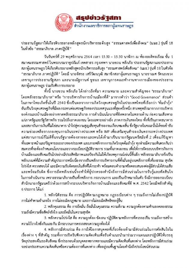 วันจันทร์ที่ 29 พฤศจิกายน 2564 เวลา 13.30–15.30 นาฬิกา ณ ห้องออดิทอเรียม ชั้น 1 สมาคมธรรมศาสตร์ ในพระบรมราชูปถัมภ์ เขตสาธร กรุงเทพฯ นายชวน หลีกภัย ประธานรัฐสภาและประธานสภาผู้แทนราษฎร ให้เกียรติบรรยายหลักสูตรนักบริหารระดับสูง “ธรรมศาสตร์เพื่อสังคม” (นมธ.) รุ่นที่ 18 ในหัวข้อ “ธรรมาภิบาล ภาคปฏิบัติ” โดยมี นายอิสระ เสรีวัฒนวุฒิ สมาชิกสภาผู้แทนราษฎร นายราเมศ รัตนะเชวง เลขานุการประธานรัฐสภา และนายณัฐกานต์ ชูชนะ เลขานุการคณะทำงานทางการเมืองของประธานสภาผู้แทนราษฎร ร่วมรับฟังการบรรยาย