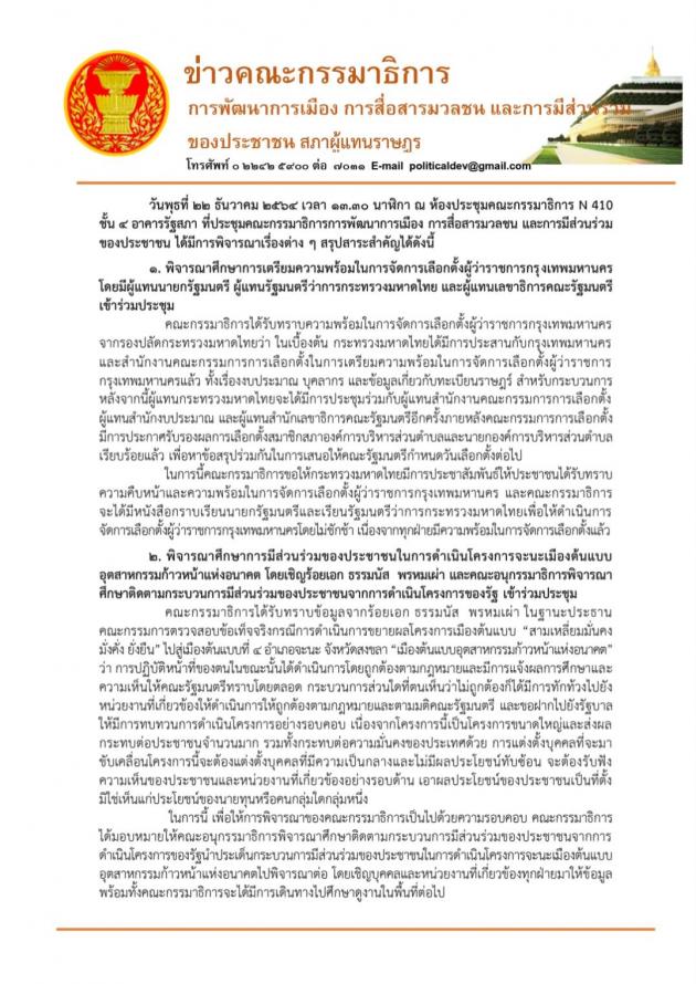 วันพฤหัสบดีที่ 23 ธันวาคม 2564 เวลา 11.35 น. ณ ห้องแถลงข่าว ชั้น 1 อาคารรัฐสภา น.ส.สุทธวรรณ สุบรรณ ณ อยุธยา และ น.ส.ฐิติภัสร์ โชติเดชาชัยนันต์ โฆษกคณะ กมธ. การพัฒนาการเมือง การสื่อสารมวลชน และการมีส่วนร่วมของประชาชน แถลงข่าวผลการประชุมของคณะ กมธ. ว่า คณะ กมธ. ได้มีการพิจารณาศึกษาการเตรียมความพร้อมในการจัดการเลือกตั้งผู้ว่าราชการกรุงเทพมหานครโดยมีผู้แทนนายกรัฐมนตรีผู้แทน รมว.มหาดไทย และผู้แทนเลขาธิการคณะรัฐมนตรี เข้าร่วมประชุม นอกจากนี้ ได้พิจารณาศึกษาการมีส่วนร่วมของประชาชนในการดำเนินโครงการจะนะเมืองต้นแบบอุตสาหกรรมก้าวหน้าแห่งอนาคต โดยเชิญ ร.อ.ธรรมนัส พรหมเผ่า สมาชิกสภาผู้แทนราษฎรและคณะอนุ กมธ. พิจารณาศึกษาติดตามกระบวนการมีส่วนร่วมของประชาชนจากการดำเนินโครงการของรัฐ เข้าร่วมประชุม