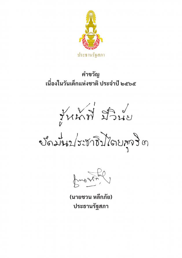ประธานรัฐสภา มอบคำขวัญวันเด็กแห่งชาติ ประจำปี 2565 "รู้หน้าที่ มีวินัย ยึดมั่นประชาธิปไตยสุจริต"