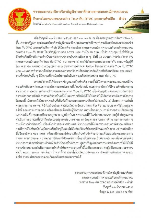 วันพุธที่ 16 มีนาคม 2565 เวลา 09.00 นาฬิกา ณ ห้องประชุม CB 406 ชั้น 4 อาคารรัฐสภา น.อ.อนุดิษฐ์  นาครทรรพ ประธานคณะ กมธ.วิสามัญพิจารณาศึกษาผลกระทบกรณีการควบรวมกิจการโทรคมนาคมระหว่าง True กับ DTAC และการค้าปลีก - ค้าส่ง เป็นประธานการประชุมคณะ กมธ. ครั้งที่ 8 เพื่อพิจารณาศึกษาผลกระทบกรณีการควบรวมกิจการโทรคมนาคมระหว่าง True กับ DTAC