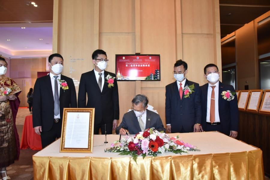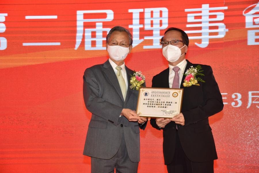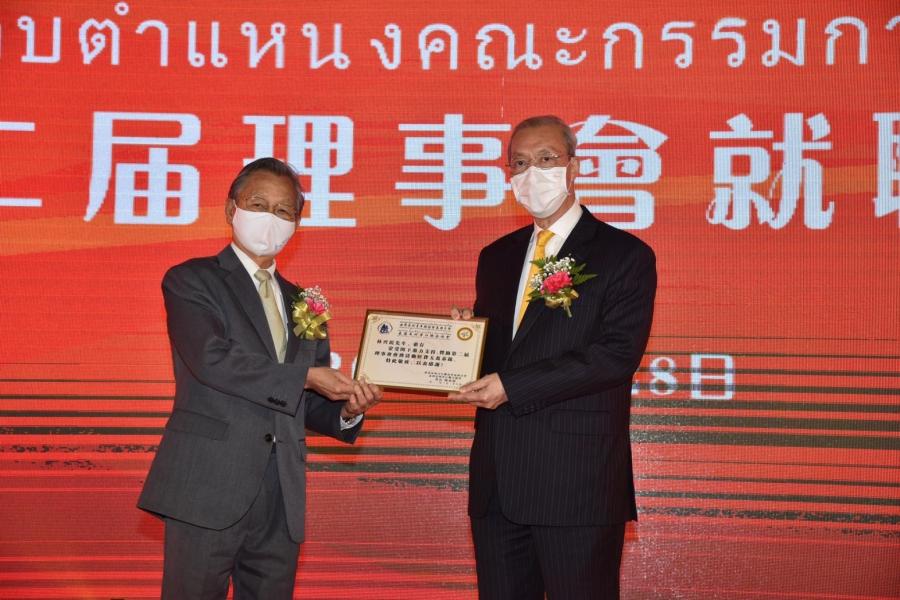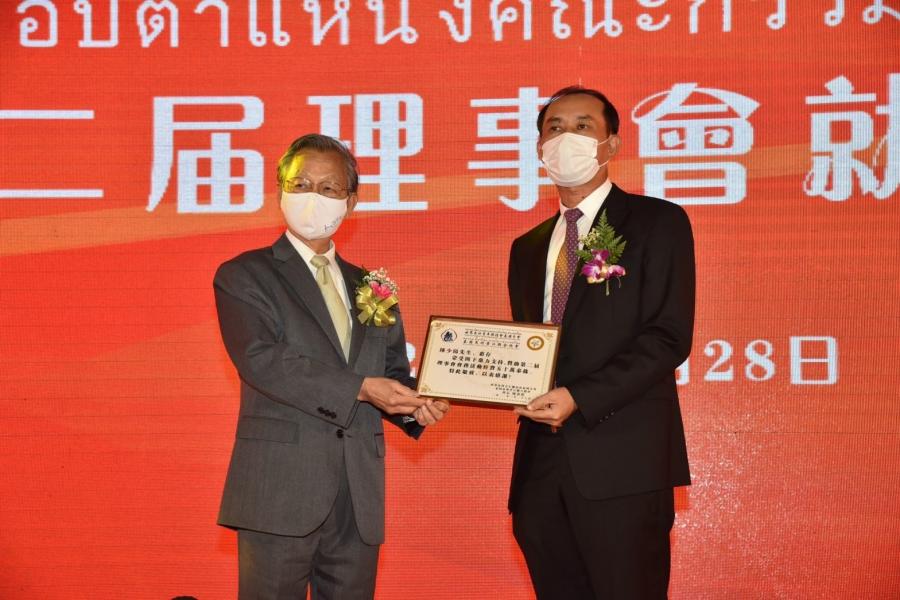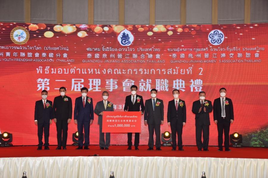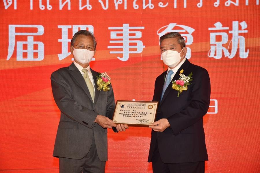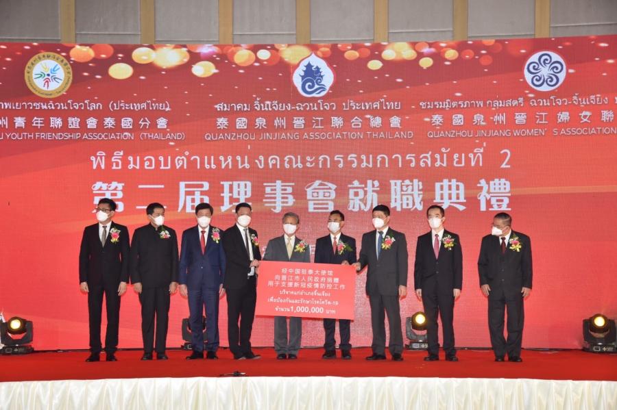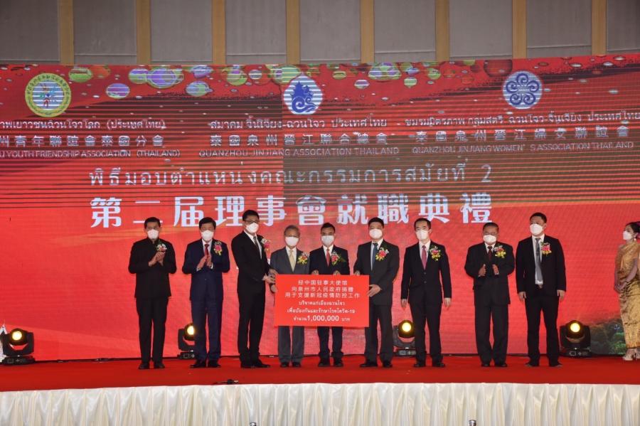 จากนั้น นายชวน หลีกภัย รับมอบเงินบริจาคจำนวน 1 ล้านบาท ให้แก่มูลนิธิเพื่อการศึกษาและสังคม และนายหลิว จิ้ง ซือ ที่ปรึกษาฝ่ายชาวจีนโพ้นทะเล สถานเอกอัครราชทูต สาธารณรัฐประชาชนจีน รับมอบเงินบริจาคจำนวน 1 ล้านบาท ให้แก่เมืองฉวนโจว สาธารณรัฐประชาชนจีน เพื่อใช้สำหรับป้องกันและรักษาโรคโควิด-19 พร้อมกันนี้ นายชวน หลีกภัย ได้มอบเกียรติบัตรแก่นายกกิตติมศักดิ์และนายกบริหารสมาคมฯ สมัยที่ 2 ด้วย