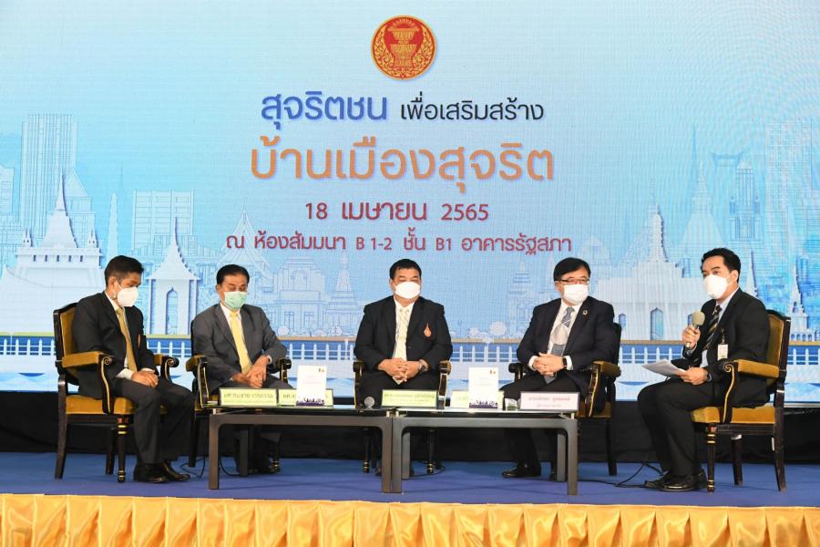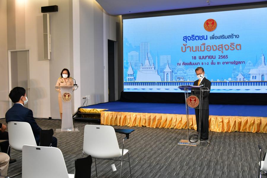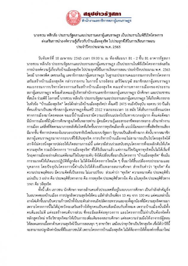 วันจันทร์ที่ 18 เมษายน 2565 เวลา 09.00 นาฬิกา ณ ห้องสัมมนา B1 - 2 ชั้น B1 อาคารรัฐสภา นายชวน หลีกภัย ประธานรัฐสภาและประธานสภาผู้แทนราษฎร เป็นประธานในพิธีเปิดโครงการส่งเสริมการนำองค์ความรู้เกี่ยวกับบ้านเมืองสุจริต ไปประยุกต์ใช้ในการเรียนการสอน ประจำปีงบประมาณ พ.ศ. 2565 โดยมี นางพรพิศ เพชรเจริญ เลขาธิการสภาผู้แทนราษฎร ในฐานะประธานคณะกรรมการบริหารโครงการเสริมสร้างบ้านเมืองสุจริต กล่าวรายงาน (รายละเอียดตามเอกสารที่แนบ)