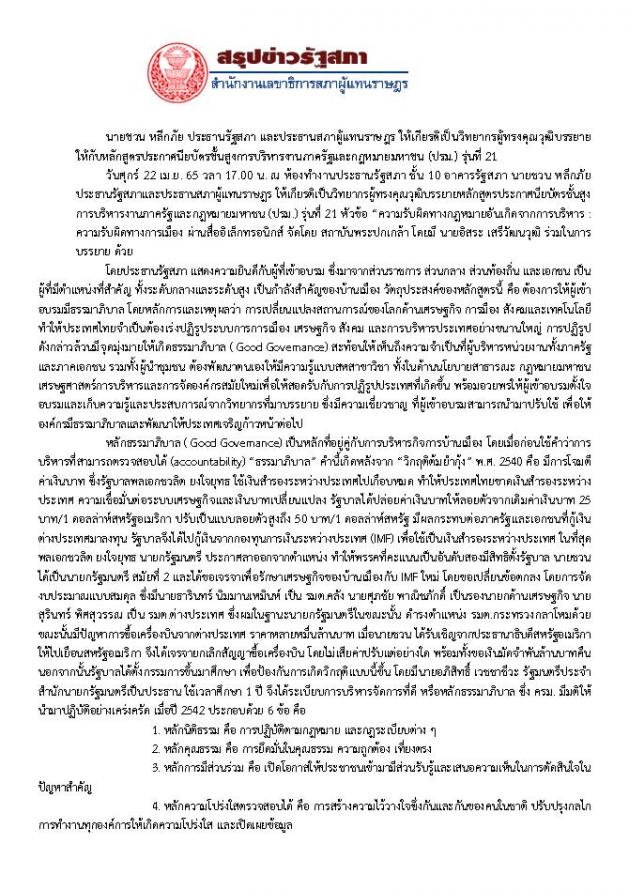 ประธานรัฐสภา ให้เกียรติเป็นวิทยากรผู้ทรงคุณวุฒิบรรยายในหลักสูตรประกาศนียบัตรชั้นสูงการบริหารงานภาครัฐและกฎหมายมหาชน (ปรม.) รุ่นที่ 21 หัวข้อ ความรับผิดทางกฎหมายอันเกิดจากการบริหาร : ความรับผิดทางการเมือง ผ่านสื่ออิเล็กทรอนิกส์