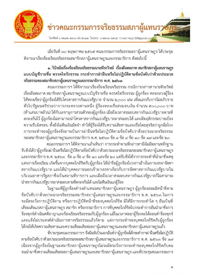 1. วินิจฉัยเรื่องร้องเรียนจริยธรรม นายพีระวิทย์ เรื่องลือดลภาค สมาชิกสภาผู้แทนราษฎรแบบบัญชีรายชื่อ พรรคไทรักธรรม กระทำการฝ่าฝืนหรือไม่ปฏิบัติตามข้อบังคับว่าด้วยประมวลจริยธรรมของสมาชิกสภาผู้แทนราษฎรและกรรมาธิการ พ.ศ. 2563