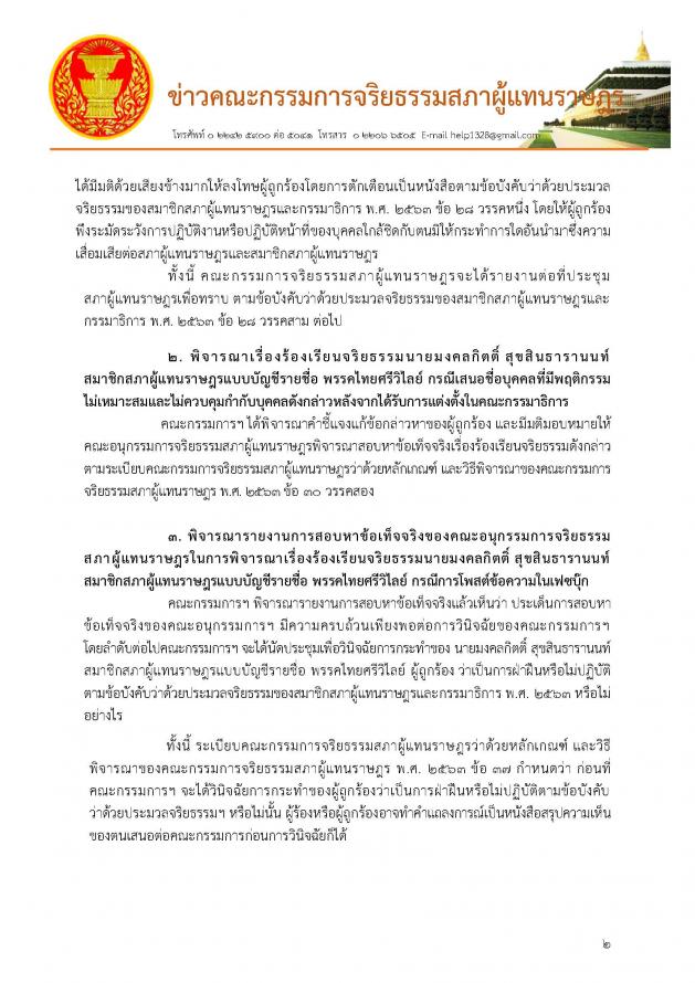 2. พิจารณาเรื่องร้องเรียนจริยธรรม นายมงคลกิตติ์ สุขสินธารานนท์ สมาชิกสภาผู้แทนราษฎรแบบบัญชีรายชื่อ พรรคไทยศรีวิไลย์ กรณีเสนอชื่อบุคคลที่มีพฤติกรรมไม่เหมาะสมและไม่ควบคุมกำกับบุคคลดังกล่าวหลังจากได้รับการแต่งตั้งในคณะกรรมาธิการ