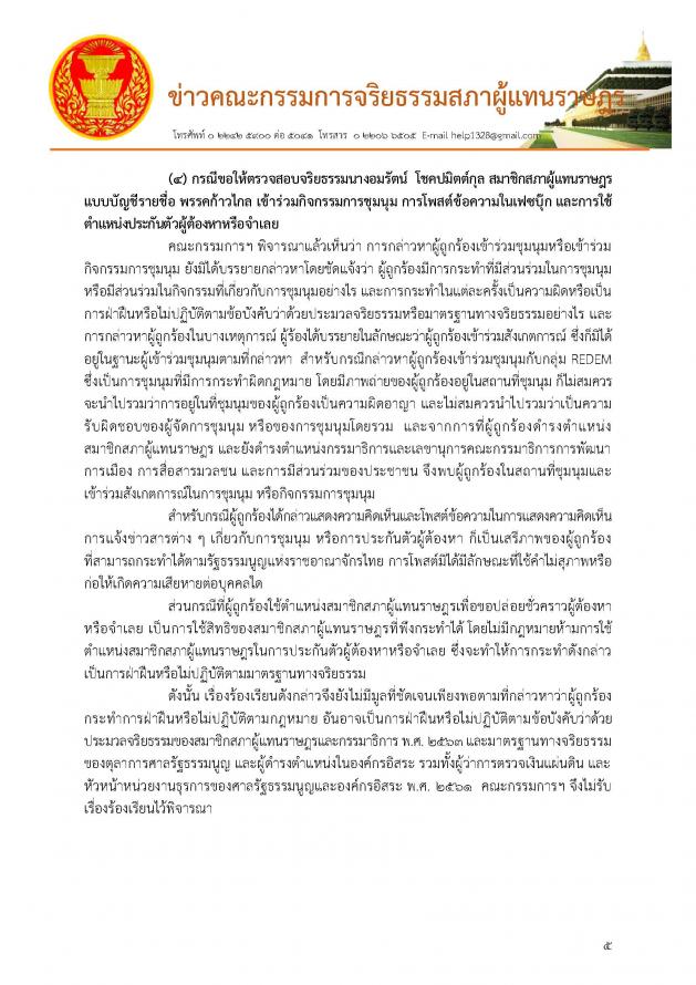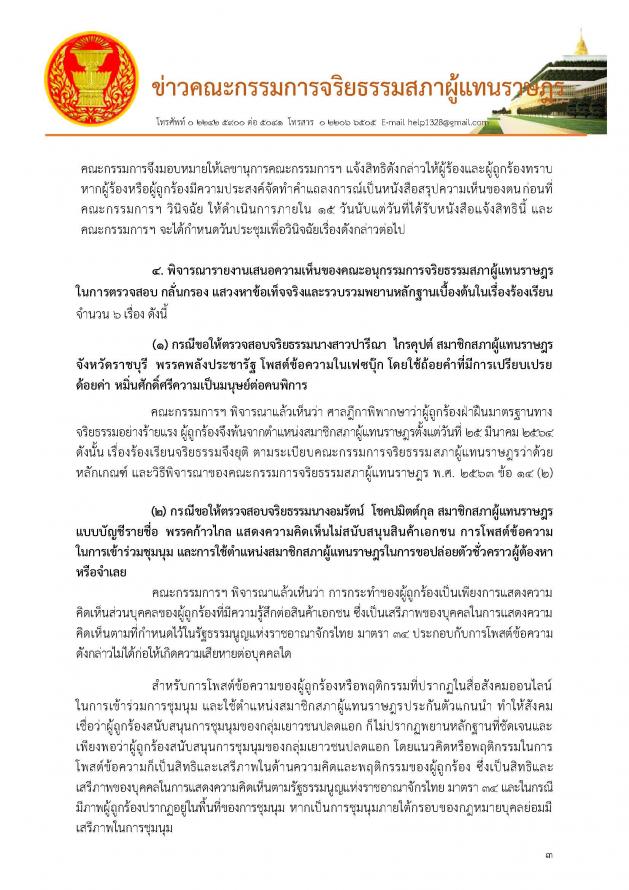 5. รับทราบและมอบหมายคณะอนุกรรมการจริยธรรมสภาผู้แทนราษฎรพิจารณาตรวจสอบ กลั่นกรอง แสวงหาข้อเท็จจริง และรวบรวมพยานหลักฐานเบื้องต้นในเรื่องร้องเรียนที่ประชาชนได้ยื่นเรื่องร้องเรียนเสนอเข้ามาใหม่ จำนวน 4 เรื่อง