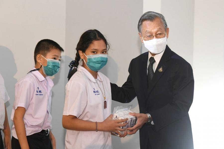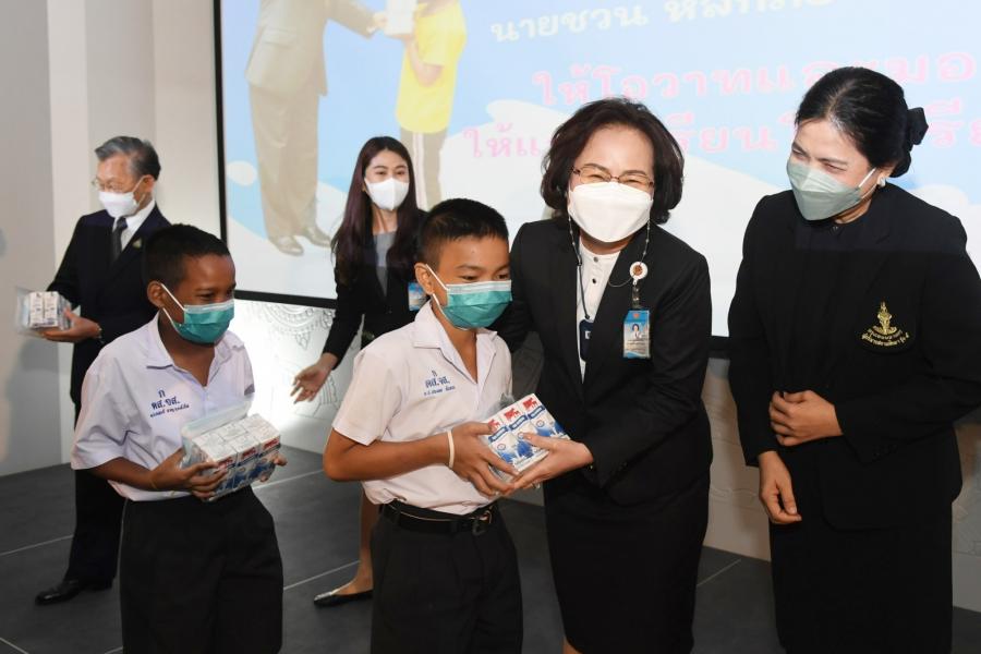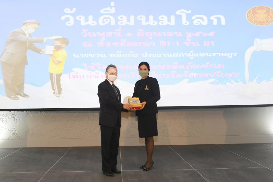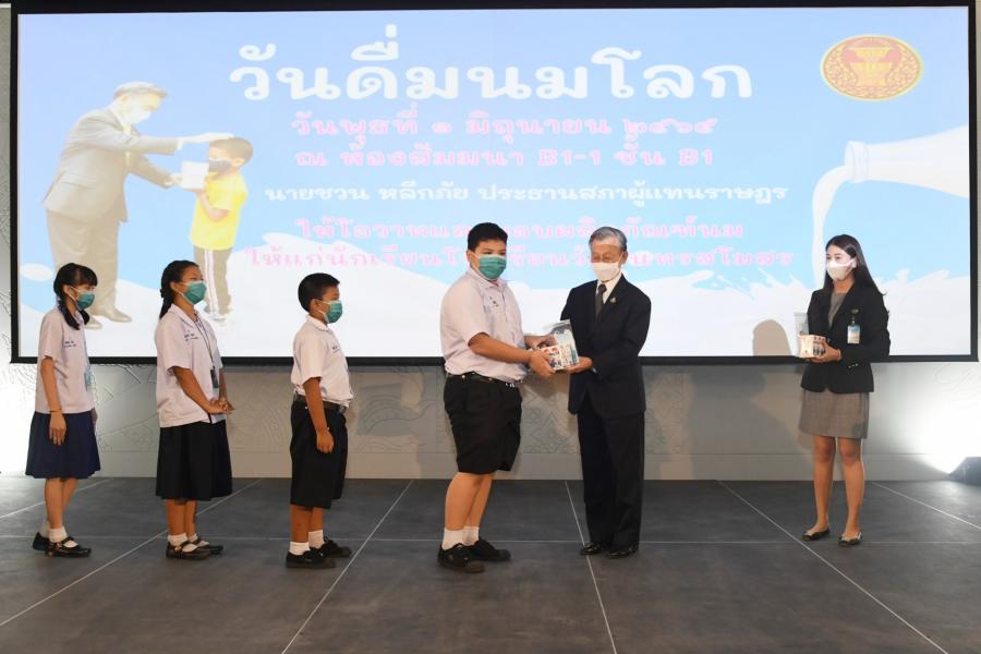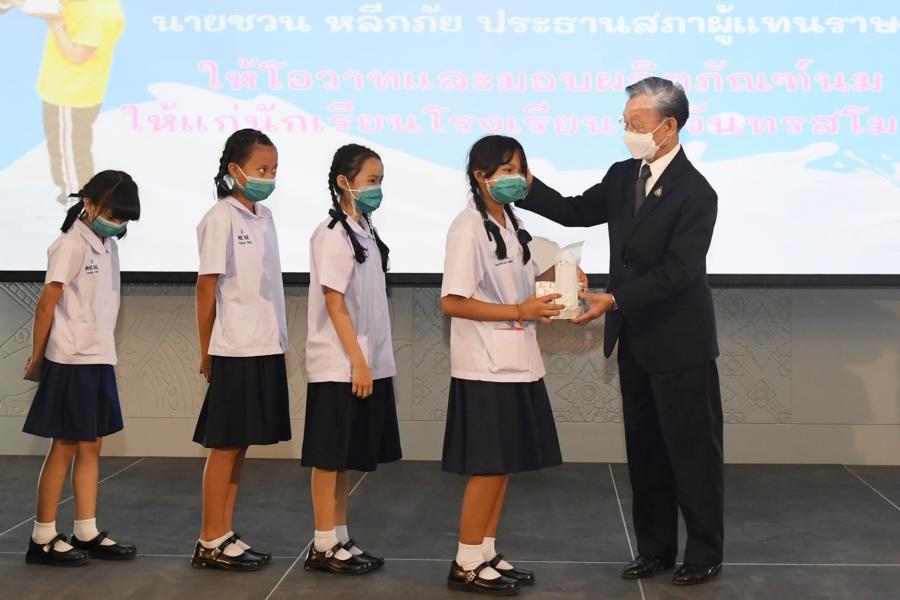 วันพุธที่ 1 มิถุนายน 2565 เวลา 16.00 นาฬิกา ณ ห้องประชุมสัมมนา B11 ชั้น B1 อาคารรัฐสภา นายชวน หลีกภัย ประธานสภาผู้แทนราษฎร เป็นประธานในพิธีมอบผลิตภัณฑ์นมกล่องสำเร็จรูปยูเอชที จากโครงการนม...เพื่อน้อง ของมูลนิธิเพื่อการศึกษาและสังคม และมอบหน้ากากสำหรับเด็ก ให้แก่นักเรียนระดับประถมศึกษา ชั้นปีที่ 5 6 ของโรงเรียนวัดจันทรสโมสร เขตดุสิต กรุงเทพฯ เนื่องในโอกาส วันดื่มนมโลก โดยมี นางพรพิศ เพชรเจริญ เลขาธิการสภาผู้แทนราษฎร กล่าวรายงาน