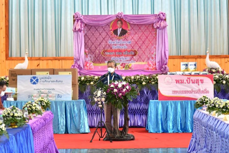 | วันอาทิตย์ที่ 5 มิถุนายน 2565 เวลา 16.00 นาฬิกา ณ ที่ว่าการอำเภอโซ่พิสัย จังหวัดบึงกาฬ นายชวน หลีกภัย ประธานรัฐสภาและประธานมูลนิธิเพื่อการศึกษาและสังคม พร้อมด้วย นายอิสระ เสรีวัฒนวุฒิ สมาชิกสภาผู้แทนราษฎรและเลขาธิการมูลนิธิฯ และนายณัฐกานต์ ชูชนะ เลขานุการคณะทำงานทางการเมืองของประธานสภาผู้แทนราษฎร ลงพื้นที่จังหวัดบึงกาฬ ซึ่งเป็นจังหวัดที่ 73 เพื่อรับฟังปัญหาความเดือดร้อน รับเรื่องร้องเรียน และพบปะเยี่ยมเยียนส่วนราชการและประชาชน รวมทั้งมอบหน้ากากอนามัยสำหรับผู้ใหญ่ จำนวน 10,000 ชิ้น หน้ากากอนามัยสำหรับเด็ก จำนวน 2,000 ชิ้น และนมผงสำหรับเด็กจากโครงการ พม.ปันสุข โดยมี นายนพดล จอมเพชร ปลัดจังหวัดบึงกาฬ นายพงษ์พัฑฒ์ สินราย นายอำเภอโซ่พิสัย และน.ส.เจนจิรา สำแดงอาจ ผู้อำนวยการศูนย์คุ้มครองคนไร้ที่พึ่งจังหวัดบึงกาฬ พร้อมด้วย นางธัญนันท์ จันทร์สวาสดิ์ หัวหน้าบ้านพักเด็กและครอบครัวจังหวัดบึงกาฬ ตลอดจนประธานอาสาสมัครพัฒนาสังคมและความมั่นคงของมนุษย์ในพื้นที่ ร่วมรับมอบ สำหรับนำไปช่วยเหลือกลุ่มเปราะบางและประชาชนในพื้นที่ ในการนี้ นายธนสุนทร สว่างสาลี รองปลัดกระทรวงการพัฒนาสังคมและความมั่นคงของมนุษย์ พร้อมด้วยคณะผู้บริหารกระทรวงฯ ร่วมมอบ