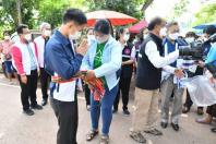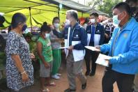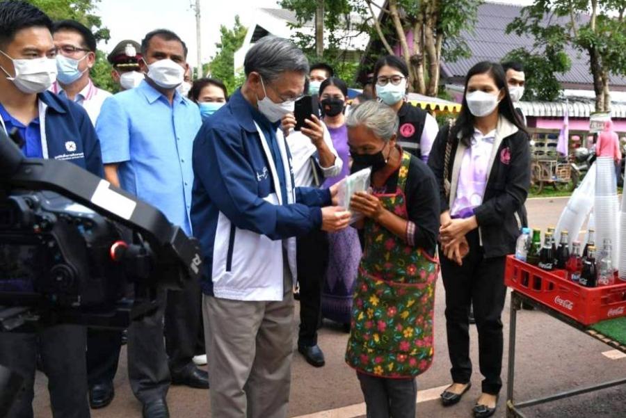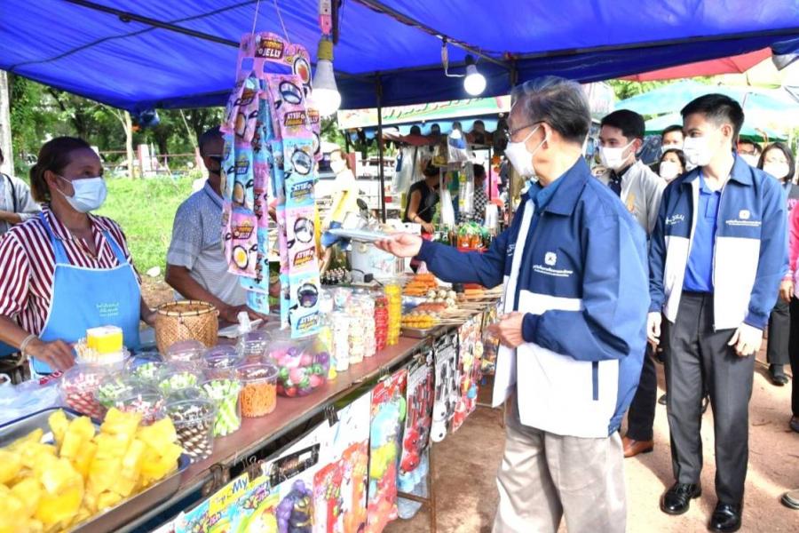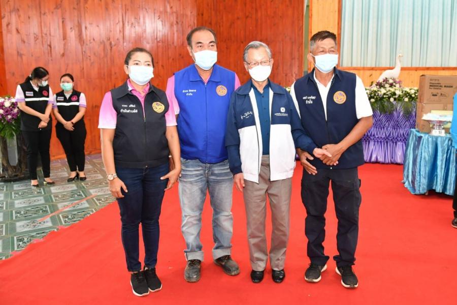 จากนั้น นายชวน หลีกภัย และคณะ ได้มอบหน้ากากอนามัยให้แก่พ่อค้าแม่ค้าและประชาชนที่มาจับจ่ายใช้สอย ณ ตลาดนัดข้างที่ว่าการอำเภอโซ่พิสัย