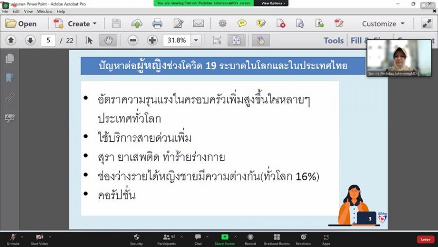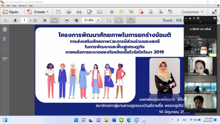 เมื่อวันอังคารที่ 14 มิ.ย. 65 วันที่สองของการจัดโครงการพัฒนาศักยภาพในการยกร่างข้อมติ ประจำปีงบประมาณ พ.ศ. 2565 ในช่วงเช้า น.ส.เพชรดาว โต๊ะมีนา สมาชิกสภาผู้แทนราษฎร ให้เกียรติบรรยายถ่ายทอดความรู้และประสบการณ์ในหัวข้อ การส่งเสริมศักยภาพและการมีส่วนร่วมของสตรี ในการพัฒนาและฟื้นฟูเศรษฐกิจภายหลังการระบาดของโรคติดเชื้อไวรัสโคโรนา 2019 โดยมีสาระสำคัญเกี่ยวกับผลกระทบที่เกิดกับสตรีในช่วงการระบาดของโรค เช่น อัตราความรุนแรงในครอบครัวเพิ่มสูงขึ้น เกิดการทำร้ายร่างกาย เกิดช่องว่างระหว่างรายได้ของหญิงและชายมากขึ้น เกิดการหย่าร้างมากขึ้น แม่เลี้ยงเดี่ยวอยู่ในสถานการณ์ที่ลำบาก การเข้าถึงบริการสาธารณสุขน้อยลงเพราะต้องเว้นระยะเวลาไปพบแพทย์ยาวนานขึ้นในช่วงระบาดของโรค การดำเนินการในด้านสาธารณสุขยากขึ้น สตรีมีภาระในการทำงานดูแลสมาชิกในบ้านมากขึ้น การถูกเลิกจ้างงาน ปัญหาด้านสุขภาพเนื่องจากผู้ทำงานด้านสาธารณสุขส่วนใหญ่เป็นผู้หญิงจึงขาดเวลาในการดูแลตนเองและครอบครัว สำหรับการรับมือกับสถานการณ์โรคระบาดในช่วงแรกในจังหวัดชายแดนใต้ได้มีการทำงานร่วมกับสาธารณสุขจังหวัด การสื่อสารกับประชาชนให้เข้าใจถึงแนวทางทางด้านสาธารณสุขอย่างถูกต้องเนื่องจากประชาชนมีความเชื่อสื่อต่าง ๆ มากกว่าแนวทางขององค์การอนามัยโลก และหน่วยงานสาธารณสุข นอกจากนี้ ผู้บรรยายได้กล่าวถึงแนวทางในการรับมือกับปัญหาในด้านสตรี อาทิ การมีส่วนร่วมของสตรีในทุกระดับและสร้างแรงจูงใจให้สตรีมีบทบาทมากขึ้น การยกระดับการศึกษาของสตรีเพื่อให้ทำงานที่มีรายได้สูง การส่งเสริมและแนะนำอาชีพใหม่ที่เกิดขึ้นและพัฒนาทักษะให้รองรับกับอาชีพเหล่านั้น การเตรียมความพร้อมรับมือกับสถาการณ์ฉุกเฉินในทุกด้าน การมีข้อมูลทางด้านเพศ การชี้นำจากภาครัฐและสนับสนุนอาชีพยุคใหม่ การมีบทบาทของภาคประชาสังคมที่มีความยืดหยุ่นในการเน้นศักยภาพของผู้หญิงในสถาการณ์ภัยพิบัติ
