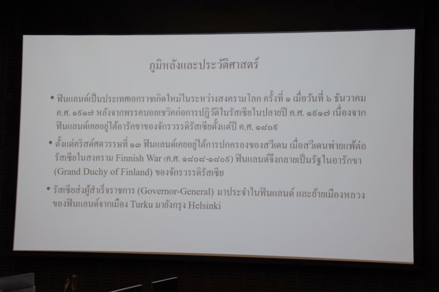 ประธานกลุ่มมิตรภาพสมาชิกรัฐสภาไทย-ฟินแลนด์ เป็นประธานในพิธีการบรรยายพิเศษ เรื่อง เหตุการณ์สำคัญของฟินแลนด์ และความร่วมมือระหว่างไทยกับฟินแลนด์
