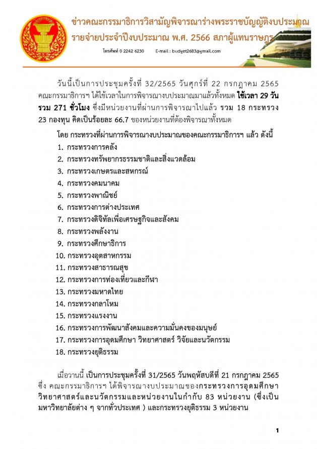 วันศุกร์ที่ 22 กรกฎาคม 2565 เวลา 14.00 นาฬิกา ณ ห้องแถลงข่าว ชั้น 1 อาคารรัฐสภา  นางกรณิศ งามสุคนธ์รัตนา นายบัญญัติ เจตนจันทร์ และนายสัณหพจน์ สุขศรีเมือง โฆษกคณะ กมธ.วิสามัญพิจารณาร่าง พ.ร.บ.งบประมาณรายจ่ายประจำปีงบประมาณ พ.ศ. 2566  แถลงข่าวความคืบหน้าการพิจารณาร่าง พ.ร.บ. งบประมาณฯ ว่า วันนี้เป็นการประชุมครั้งที่ 32 ซึ่งคณะ กมธ. ได้ใช้เวลาในการพิจารณางบประมาณมาแล้วทั้งหมด 29 วัน รวม 271 ชั่วโมง มีหน่วยงานที่ผ่านการพิจารณาไปแล้วรวม 18 กระทรวง 23 กองทุน คิดเป็นร้อยละ 66.7 ของหน่วยงานที่ต้องพิจารณาทั้งหมด
