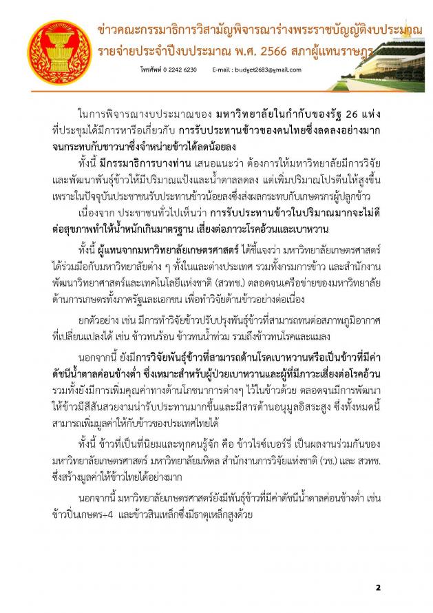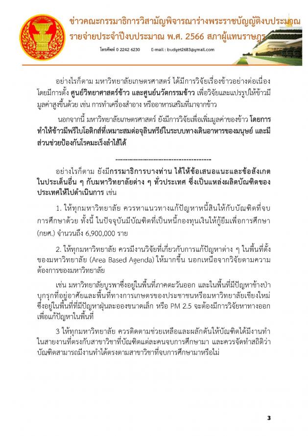 สำหรับการประชุมครั้งที่ 31 เมื่อวานนี้ (21 ก.ค. 65) คณะ กมธ. ได้พิจารณางบประมาณของกระทรวงการอุดมศึกษา วิทยาศาสตร์ วิจัยและนวัตกรรม และหน่วยงานในกำกับ 83 หน่วยงาน (ซึ่งเป็นมหาวิทยาลัยต่าง ๆ จากทั่วประเทศ) และกระทรวงยุติธรรม 3 หน่วยงาน  ในการพิจารณางบประมาณของมหาวิทยาลัยในกำกับของรัฐ 26 แห่ง ที่ประชุมได้มีการหารือเกี่ยวกับ การรับประทานข้าวของคนไทยซึ่งลดลงอย่างมากจนกระทบกับชาวนาซึ่งจำหน่ายข้าวได้ลดน้อยลง ทั้งนี้ มีกรรมาธิการเสนอแนะว่า ต้องการให้มหาวิทยาลัยมีการวิจัยและพัฒนาพันธุ์ข้าวให้เหมาะสมกับความต้องการของผู้บริโภค
