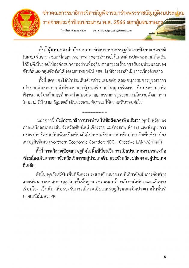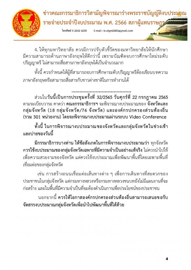 ส่วนการประชุมคณะ กมธ.ในวันนี้ (22 ก.ค. 65)  ซึ่งคณะ กมธ. ได้พิจารณางบประมาณของจังหวัดและกลุ่มจังหวัด (18 กลุ่มจังหวัด/ 76 จังหวัด) และองค์กรปกครองส่วนท้องถิ่น (รวม 301 หน่วยงาน) โดยจะพิจารณางบประมาณผ่านระบบ  Video Conference ทั้งนี้ มีกรรมาธิการให้ข้อสังเกตในการพิจารณางบประมาณว่า ทุกจังหวัดควรใช้งบประมาณของกลุ่มจังหวัดเฉพาะที่มีความจำเป็นเท่านั้น ไม่ควรนำไปใช้เพื่อความสวยงามของจังหวัด แต่ควรใช้งบประมาณเพื่อพัฒนาพื้นที่โดยเฉพาะพื้นที่เชื่อมต่อของกลุ่มจังหวัด (รายละเอียดตามเอกสารที่แนบ)