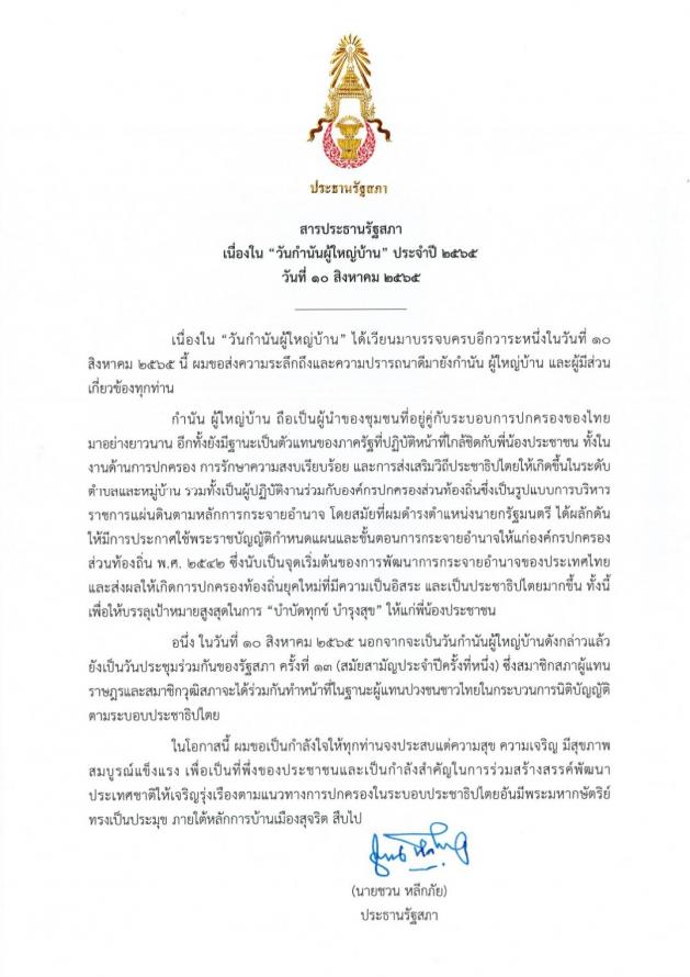 สารประธานรัฐสภา เนื่องใน วันกำนัน ผู้ใหญ่บ้าน ประจำปี 2565