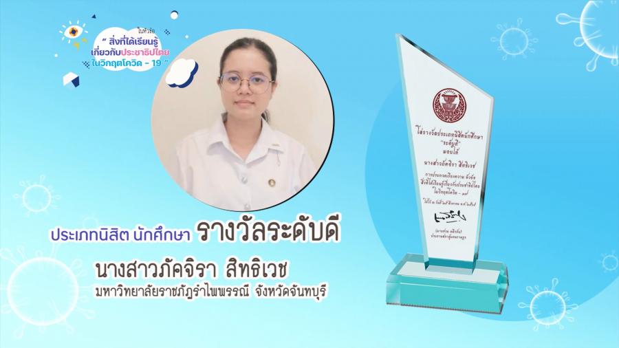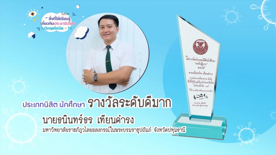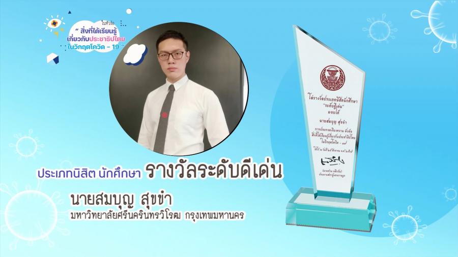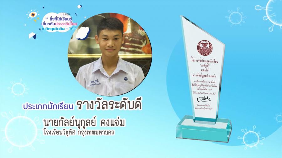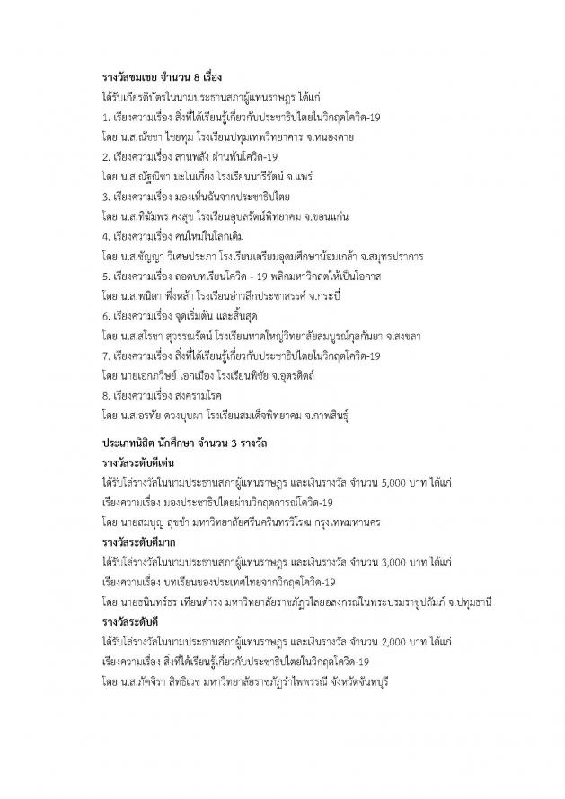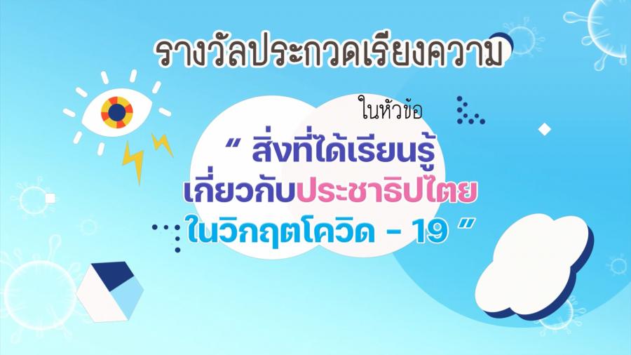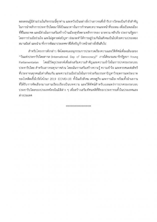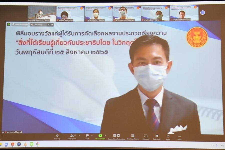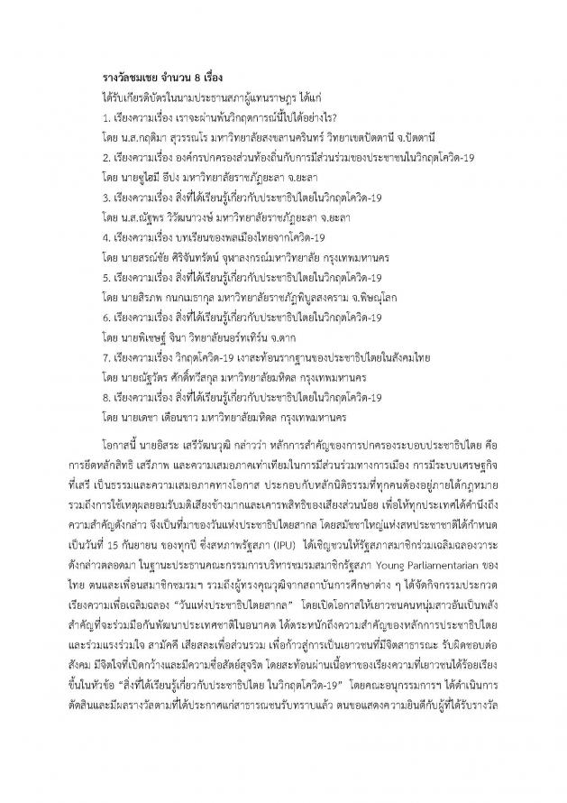 ประธานคณะกรรมการบริหารชมรมสมาชิกรัฐสภา Young Parliamentarian เป็นประธานในพิธีมอบรางวัลแก่ผู้ได้รับการคัดเลือกผลงานประกวดเรียงความ “สิ่งที่ได้เรียนรู้เกี่ยวกับประชาธิปไตย ในวิกฤตโควิด-19” พร้อมกล่าวแสดงความยินดี ผ่านสื่ออิเล็กทรอนิกส์