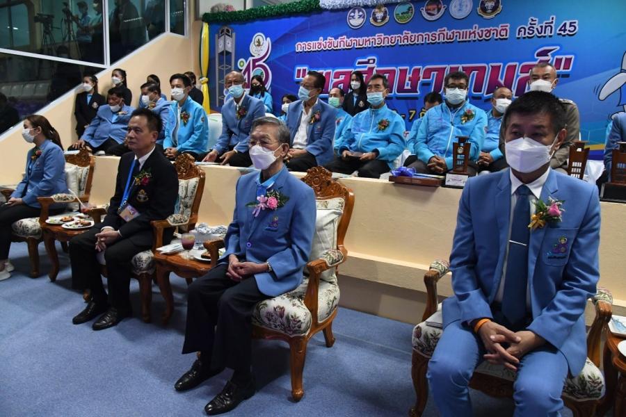 ทั้งนี้ ประธานรัฐสภา กล่าวว่า ตนมีความยินดีและเป็นเกียรติที่ได้มาเป็นประธานในพิธีเปิดการแข่งขันกีฬามหาวิทยาลัยการกีฬาแห่งชาติ ครั้งที่ 45 ซึ่งการแข่งขันดังกล่าวได้จัดขึ้นหลังจากภารกิจนี้ต้องหยุดลงอันเป็นผลกระทบจากการระบาดของโรคติดเชื้อไวรัสโคโรนา 2019 จึงขอแสดงความชื่นชมยินดีที่มหาวิทยาลัยการกีฬาแห่งชาติได้จัดการแข่งขันในครั้งนี้ หลังจากที่ต้องหยุดภารกิจนี้ไป 2 ปี โดยกิจกรรมนี้นอกจากจะต้องให้นักศึกษาของสถาบันทุกวิทยาเขตได้ฝึกฝนการเรียนในภาคปฏิบัติเพื่อรักษามาตรฐานการกีฬาของมหาวิทยาลัยการกีฬาแห่งชาติในด้านฝีมือและความสามารถแล้ว ยังต้องฝึกฝนความมีน้ำใจนักกีฬา การปฏิบัติตามกฎ ระเบียบ และกติกา ซึ่งไม่เป็นเพียงมาตรฐานของนักกีฬาเท่านั้น แต่ยังเป็นคุณสมบัติสำคัญของพลเมืองในระบอบประชาธิปไตยด้วย โดยกิจกรรมครั้งนี้ยังมีส่วนในการสร้างความเชื่อมั่นให้แก่ประเทศไทยว่ามีความพร้อมที่จะรองรับกิจกรรมต่าง ๆ โดยปลอดภัยจากโรคติดเชื้อ และเป็นการส่งเสริม สนับสนุนงานด้านการท่องเที่ยวอีกทางหนึ่งด้วย จึงขอแสดงความชื่นชมยินดีและขอบคุณทุกฝ่าย ทั้งภาครัฐ ภาคเอกชน โดยเฉพาะผู้นำท้องถิ่น และธุรกิจเอกชนต่าง ๆ ที่ให้การสนับสนุน ในฐานะที่ตนเป็นชาวตรังและในฐานะเป็นผู้ก่อตั้งวิทยาเขตนี้เมื่อ 40 ปีที่แล้ว เมื่อครั้งดำรงตำแหน่ง รมว.ศึกษาธิการ มีความภาคภูมิใจที่สถาบันมีความพร้อมในการจัดงานครั้งนี้ และขอต้อนรับพี่น้องชาวมหาวิทยาลัยการกีฬาแห่งชาติทุกฝ่าย ทุกคน ที่มาร่วมงานในวันนี้ด้วยความยินดี ด้วยความจริงใจ และขออวยพรให้ภารกิจในครั้งนี้ประสบความสำเร็จทุกประการ