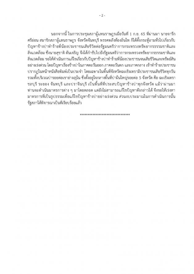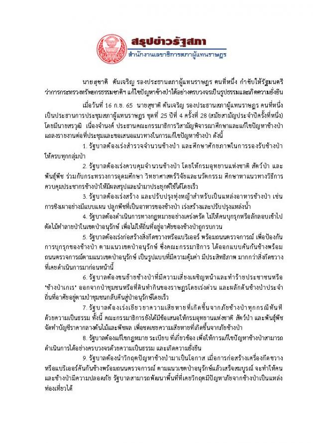 รองประธานสภาผู้แทนราษฎร คนที่หนึ่ง เป็นประธานการประชุมสภาผู้แทนราษฎร ชุดที่ 25 ปีที่ 4 ครั้งที่ 28 (สมัยสามัญประจำปีครั้งที่หนึ่ง) โดยมี นายสรวุฒิ เนื่องจำนงค์ ประธานคณะกรรมาธิการวิสามัญพิจารณาศึกษาและแก้ไขปัญหาช้างป่าแถลงรายงานต่อที่ประชุมและขอเสนอแนวทางในการแก้ไขปัญหาช้างป่า
