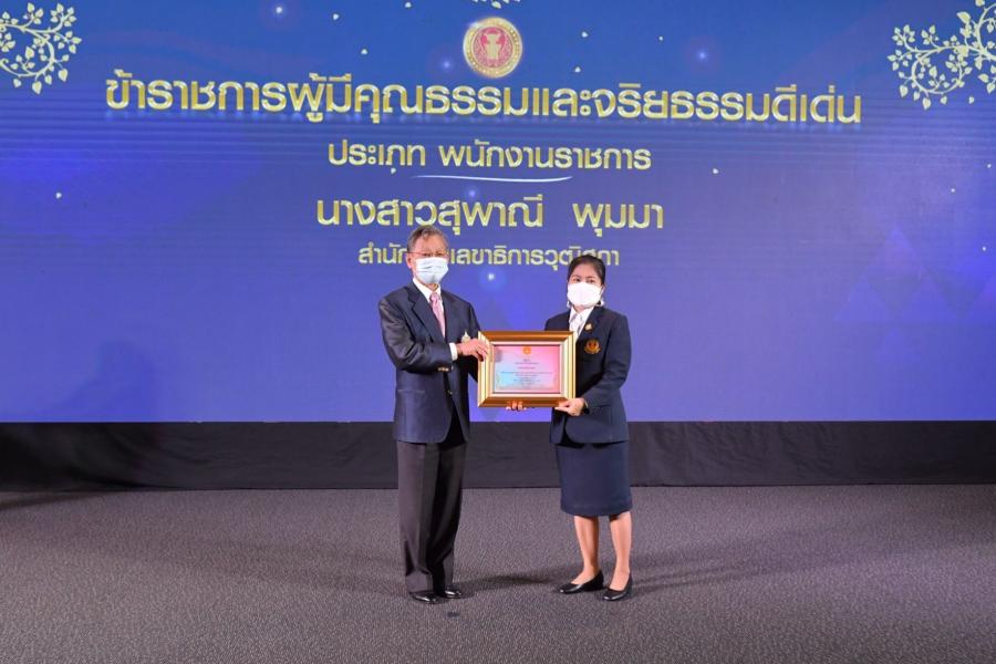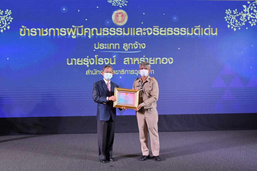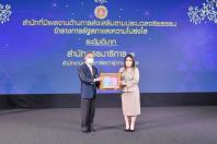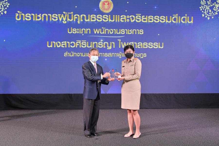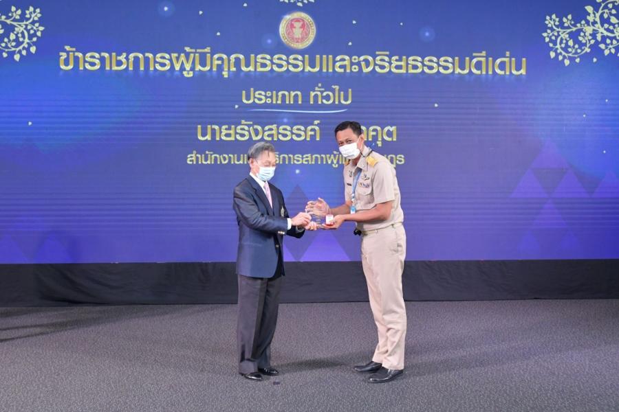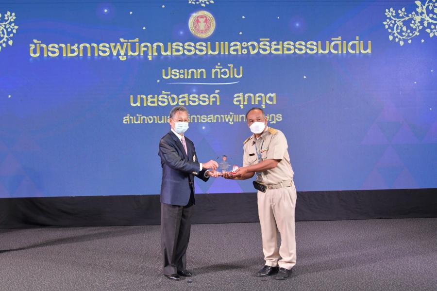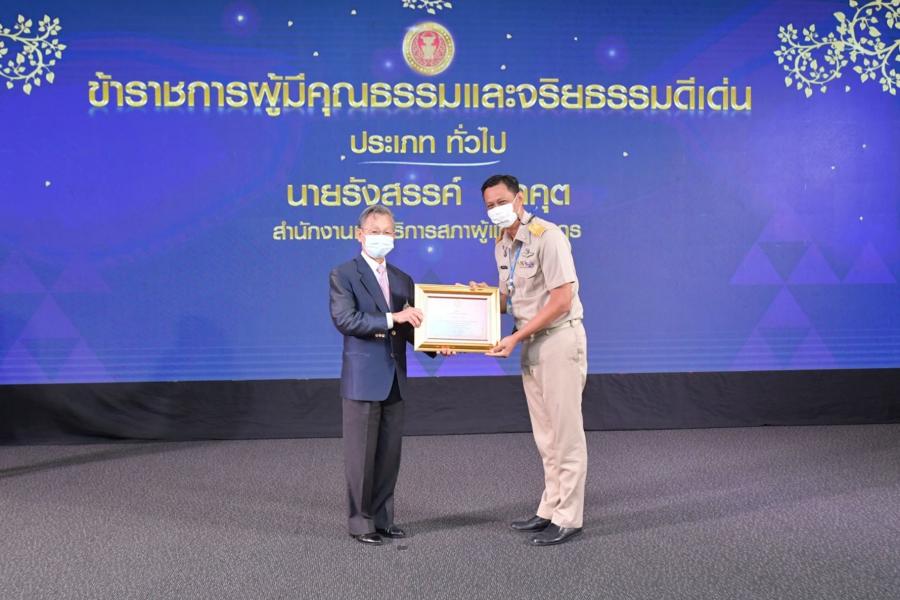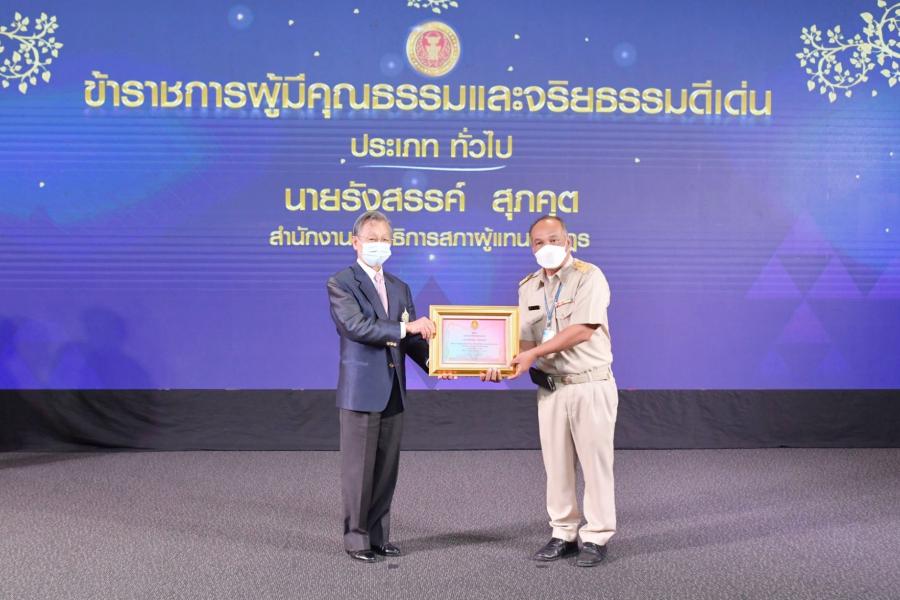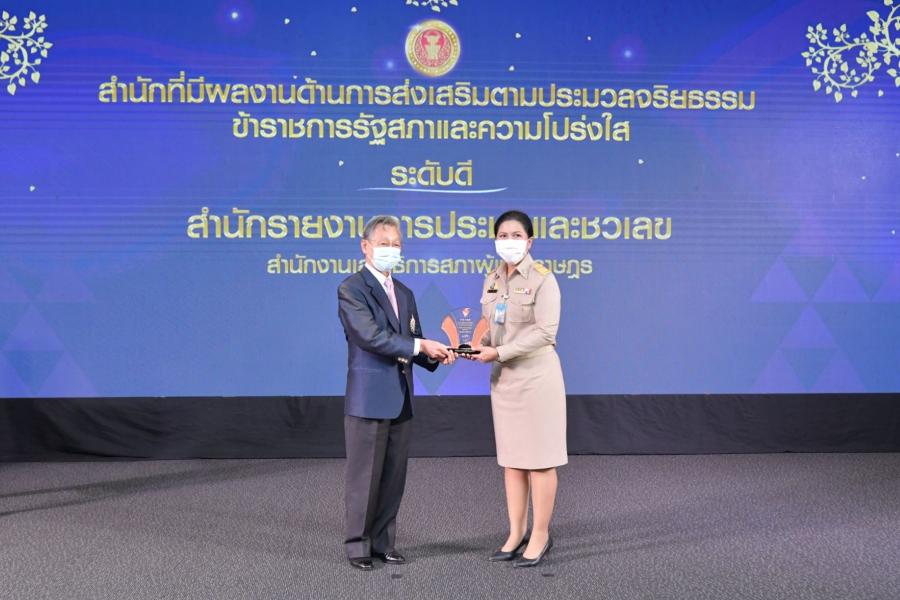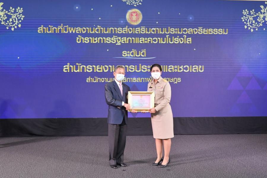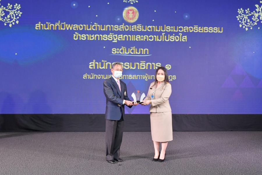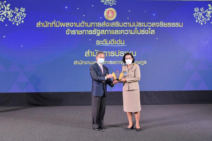 จากนั้น ประธานรัฐสภา มอบโล่ยกย่องประกาศเกียรติคุณและเกียรติบัตร ให้แก่สำนักที่มีผลงานด้านการส่งเสริมตามประมวลจริยธรรมข้าราชการ รัฐสภาและความโปร่งใส ประจำปีงบประมาณ พ.ศ. 2565 ของสำนักงานเลขาธิการสภาผู้แทนราษฎร จำนวน 3 รางวัล ได้แก่ 1. รางวัลระดับ "ดีเด่น" ได้แก่ สำนักการประชุม 2. รางวัลระดับ "ดีมาก" ได้แก่ สำนักกรรมาธิการ 1 3. รางวัลระดับ "ดี" ได้แก่ สำนักรายงานการประชุมและขวเลข