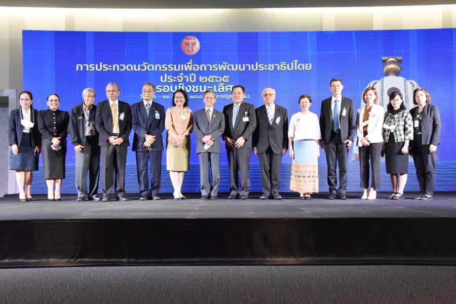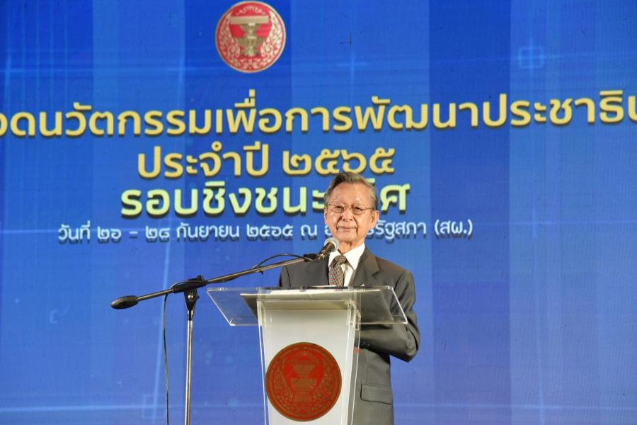 นายชวน หลีกภัย ประธานรัฐสภา กล่าวแสดงความยินดีกับคณะผู้จัดงานและผู้ชนะการแข่งขันการประกวดนวัตกรรมเพื่อการพัฒนาประชาธิปไตย ประจำปี 2565 โดยขอให้ทุกได้ภาคภูมิใจกับผลงานที่ส่งเข้าประกวดที่ผ่านการพิจารณาจากคณะกรรมการ ผู้ทรงเกียรติ ซึ่งได้ให้นโยบายไปว่า ขอให้เป็นกิจกรรมที่ส่งเสริมวิถีประชาธิปไตยจริง ขออย่าเป็นการล่ารางวัล เนื่องจากวิถีประชาธิปไตยแท้จริงอยู่ที่การปฏิบัติ มากกว่าทฤษฎี เพราะในแง่ทฤษฎีเป็นที่รู้ดีอยู่แล้ว ต้องส่งเสริมวิถีประชาธิปไตยในแนวทางปฏิบัติ ด้วยการมีส่วนร่วมกับทางราชการ ส่วนร่วมกับองค์กรในการเข้าไปทำกิจกรรม เพื่อประโยชน์ของส่วนรวม และการทำงานกับส่วนรวม ไม่มีที่ใดจะมีมติเป็นเอกฉันท์ มักมีข้อขัดแย้ง มีประโยชน์ของแต่ละฝ่ายที่ไม่เหมือนกัน ในฐานะที่เป็นสมาชิกสภาผู้แทนราษฎร มีความเข้าใจดีเรื่องนี้ดี เวลามีเรื่องร้องเรียน จะมีความคิดเห็นแตกต่างกันไป ไม่เป็นเอกฉันท์ แต่ต้องยึดเสียงข้างมากที่เป็นประโยชน์ต่อส่วนรวม อย่างกรณีโครงการเบี้ยผู้สูงอายุ และ กองทุนเงินให้กู้ยืมเพื่อการศึกษา (กยศ.)