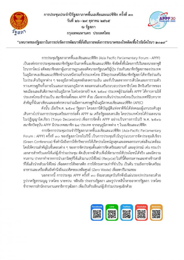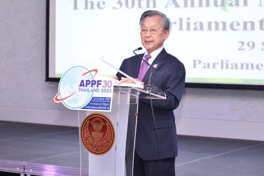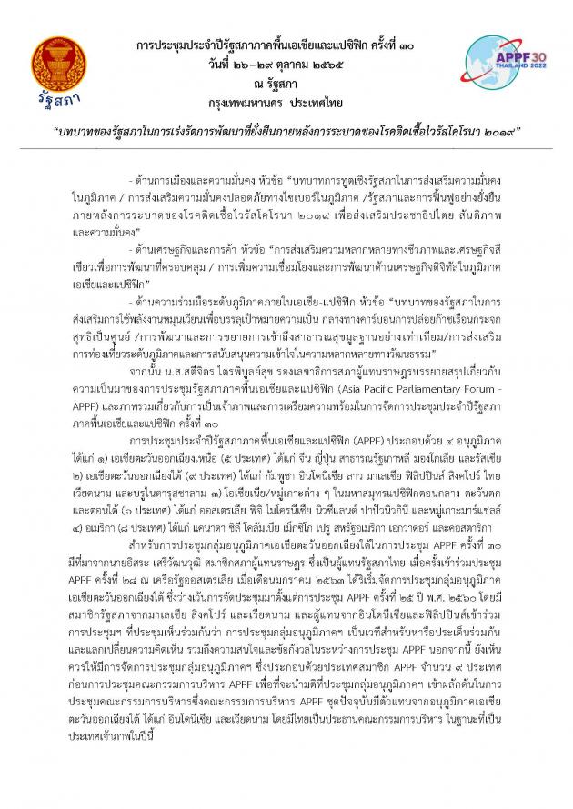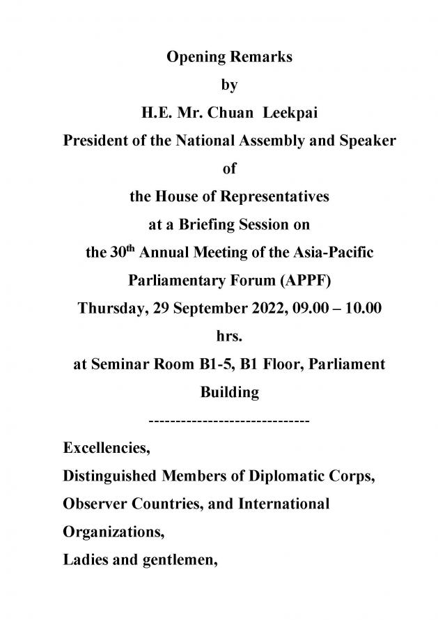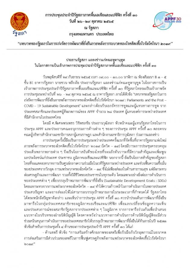 วันพฤหัสบดีที่ 29 กันยายน 2565 เวลา 09.00 นาฬิกา ณ ห้องสัมมนา B1-5 ชั้น B1 อาคารรัฐสภา นายชวน หลีกภัย ประธานรัฐสภา เป็นประธานในการแถลงข่าวแก่คณะทูตานุทูตในโอกาสการเป็นเจ้าภาพการประชุมประจำปีรัฐสภาภาคพื้นเอเชียและแปซิฟิก ครั้งที่ 30 โดยมี ศ.พิเศษพรเพชร วิชิตชลชัย ประธานวุฒิสภา เอกอัครราชทูตจาก 7ประเทศ ได้แก่ สาธารณรัฐฟิลิปปินส์ สาธารณรัฐสังคมนิยมเวียดนาม เม็กซิโก สาธารณรัฐโคลอมเบีย สาธารณรัฐชิลี สาธารณรัฐประชาธิปไตยประชาชนลาว และสาธารณรัฐเปรู พร้อมด้วย คณะทูตานุทูต ประเทศผู้สังเกตการณ์ องค์การระหว่างประเทศ รวมทั้งสิ้น 20 ประเทศสมาชิก 1 ประเทศผู้สังเกตการณ์ และ 1 องค์การระหว่างประเทศ ตลอดจน นายเกียรติ สิทธีอมร สมาชิกสภาผู้แทนราษฎร ในฐานะประธานคณะอนุกรรมการด้านการเมืองและความมั่นคงในการประชุมประจำปีรัฐสภาภาคพื้นเอเชียและแปซิฟิก (APPF) ครั้งที่ 30 นางพิกุลแก้ว ไกรฤกษ์ สมาชิกวุฒิสภา ในฐานะประธานคณะอนุกรรมการด้านพิธีการ การอำนวยความสะดวก และงานเลี้ยง นายอิสระ เสรีวัฒนวุฒิ สมาชิกสภาผู้แทนราษฎร ในฐานะประธานคณะอนุกรรมการด้านการประชาสัมพันธ์และสารสนเทศการประชุม นายธัญวัจน์ กมลวงศ์วัฒน์ สมาชิกสภาผู้แทนราษฎร ในฐานะรองประธานคณะอนุกรรมการด้านสมาชิกรัฐสภาสตรี คณะทำงานทางการเมืองของประธานสภาผู้แทนราษฎร เลขาธิการสภาผู้แทนราษฎร เลขาธิการวุฒิสภา และผู้บริหารสำนักงานเลขาธิการสภาผู้แทนราษฎรและสำนักงานเลขาธิการวุฒิสภา ร่วมพิธีเปิด