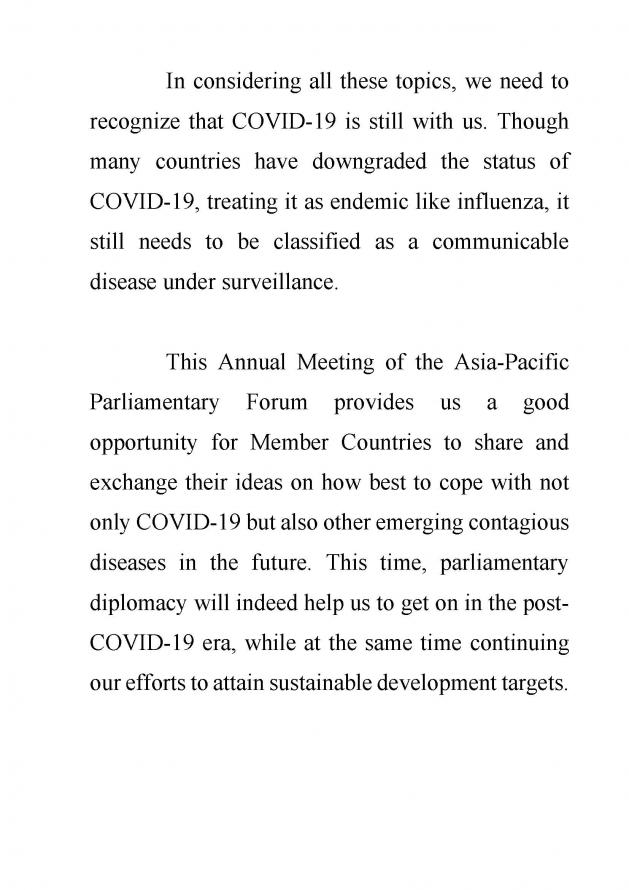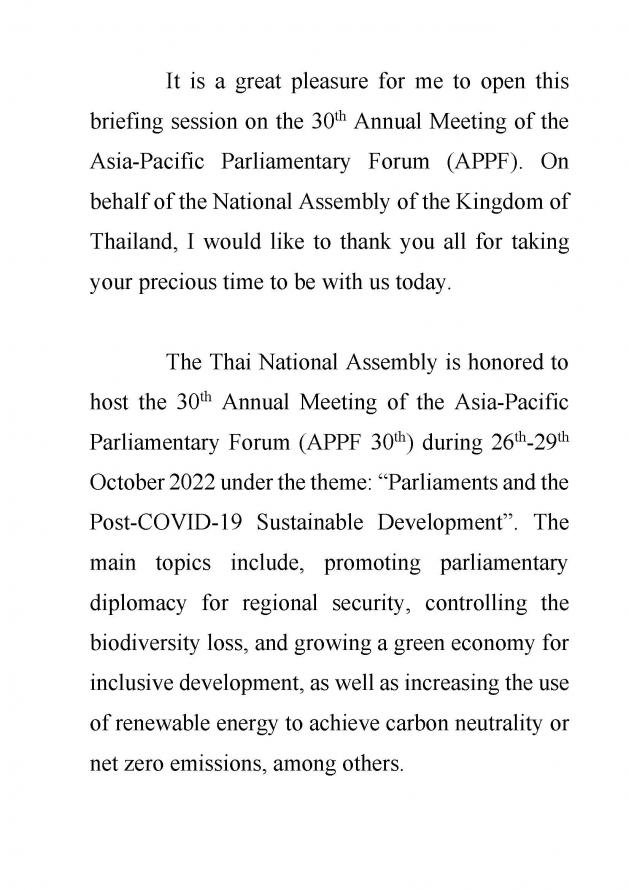 ทั้งนี้ นายชวน หลีกภัย กล่าวว่า เป็นเกียรติอย่างยิ่งที่ได้เป็นประธานในการแถลงข่าวแก่คณะทูตานุทูตในโอกาสการเป็นเจ้าภาพการประชุมประจำปีรัฐสภาภาคพื้นเอเชียและแปซิฟิก ครั้งที่ 30 ในนามของรัฐสภาไทย ขอขอบคุณทุกท่านที่สละเวลาอันมีค่ามาร่วมงานกับเรา รัฐสภาไทยเป็นเกียรติอย่างยิ่งที่ได้เป็นเจ้าภาพจัดการประชุมประจำปีรัฐสภาภาคพื้นเอเชียและแปซิฟิก ครั้งที่ 30 ระหว่างวันที่ 26 - 29 ต.ค. 65 ภายใต้หัวข้อ "บทบาทของรัฐสภาในการเร่งรัดการพัฒนาอย่างยั่งยืนภายหลังการระบาดของโรคติดเชื้อไวรัสโคโรนา 2019" โดยหัวข้อหลัก อาทิ บทบาทการทูตเชิงรัฐสภาในการส่งเสริมความมั่นคงในภูมิภาค การส่งเสริมความหลากหลายทางชีวภาพและเศรษฐกิจสีเขียวเพื่อการพัฒนาที่ครอบคลุม รวมทั้งบทบาทของรัฐสภาในการส่งเสริมการใช้พลังงานหมุนเวียนเพื่อบรรลุเป้าหมายความเป็นกลางคาร์บอน การปล่อยก๊าซเรือนกระจกสุทธิเป็นศูนย์ ซึ่งในการพิจารณาหัวข้อเหล่านี้ เราต้องตระหนักว่าโควิด-19 ยังอยู่กับเรา แม้ว่าหลายประเทศได้ลดระดับสถานะของโควิด-19 โดยรักษาให้เป็นเชื้อโรค เช่น ไข้หวัดใหญ่ แต่ก็ยังคงต้องจัดเป็นโรคติดต่อภายใต้การเฝ้าระวังในปัจจุบัน การประชุมประจำปีรัฐสภาภาคพื้นเอเชียและแปซิฟิก ครั้งที่ 30 นี้ นับเป็นโอกาสที่ดีสำหรับประเทศสมาชิกที่จะแบ่งปันและแลกเปลี่ยนความคิดเห็นเกี่ยวกับวิธีที่ดีที่สุดในการรับมือกับโรคโควิด-19 และยังรวมถึงโรคติดต่ออื่น ๆ ที่กำลังเกิดขึ้นในอนาคต โดยในครั้งนี้ บทบาทการทูตเชิงรัฐสภาจะช่วยให้เราสามารถก้าวเข้าสู่ยุคหลังโควิด-19 ในขณะเดียวกันก็พยายามอย่างต่อเนื่องเพื่อบรรลุเป้าหมายการพัฒนาที่ยั่งยืน ดังที่เราทราบกันดีว่าโรคโควิด-19 และความขัดแย้งทางการเมืองทางภูมิศาสตร์กำลังคุกคามเศรษฐกิจโลกด้วยภาวะเศรษฐกิจถดถอยซึ่งจะส่งผลเสียต่อหลายประเทศทั่วโลก อย่างไรก็ตาม ตนยังคงเชื่อว่า เราจะไม่ปล่อยให้ความล้มเหลวดังกล่าวมาขวางทางของเรา และความพยายามร่วมกันผ่านการทูตเชิงรัฐสภาที่มีปฏิสัมพันธ์ระหว่างความคิดและวิสัยทัศน์ระหว่างประเทศสมาชิกซึ่งจะมีส่วนช่วยให้บรรลุวัตถุประสงค์ร่วมกันและเป้าหมายการพัฒนาที่ยั่งยืนของเราได้ สำหรับในวันนี้ ได้จัดให้มีการบรรยายสรุป เพื่อให้ข้อมูลเกี่ยวกับการประชุมประจำปีรัฐสภาภาคพื้นเอเชียและแปซิฟิก (APPF) ครั้งที่ 30 ที่กำลังจะเกิดขึ้น เพื่อให้คณะทูตานุทูต ประเทศผู้สังเกตการณ์ และองค์การระหว่างประเทศ ได้รับข้อมูลเป็นอย่างดี สามารถเข้าถึงข้อมูลที่เกี่ยวข้อง สิ่งอำนวยความสะดวกและบ