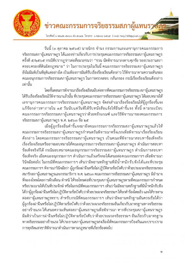 วันจันทร์ที่ 3 ตุลาคม 2565 เวลา 13.30 นาฬิกา ณ ห้องประชุม CA 408 ชั้น 4 อาคารรัฐสภา นายชวน หลีกภัย ประธานสภาผู้แทนราษฎร เป็นประธานการประชุมคณะกรรมการจริยธรรมสภาผู้แทนราษฎร ครั้งที่ 5/2565 โดยมี นายชลน่าน  ศรีแก้ว  ผู้นำฝ่ายค้านในสภาผู้แทนราษฎร ร่วมประชุม