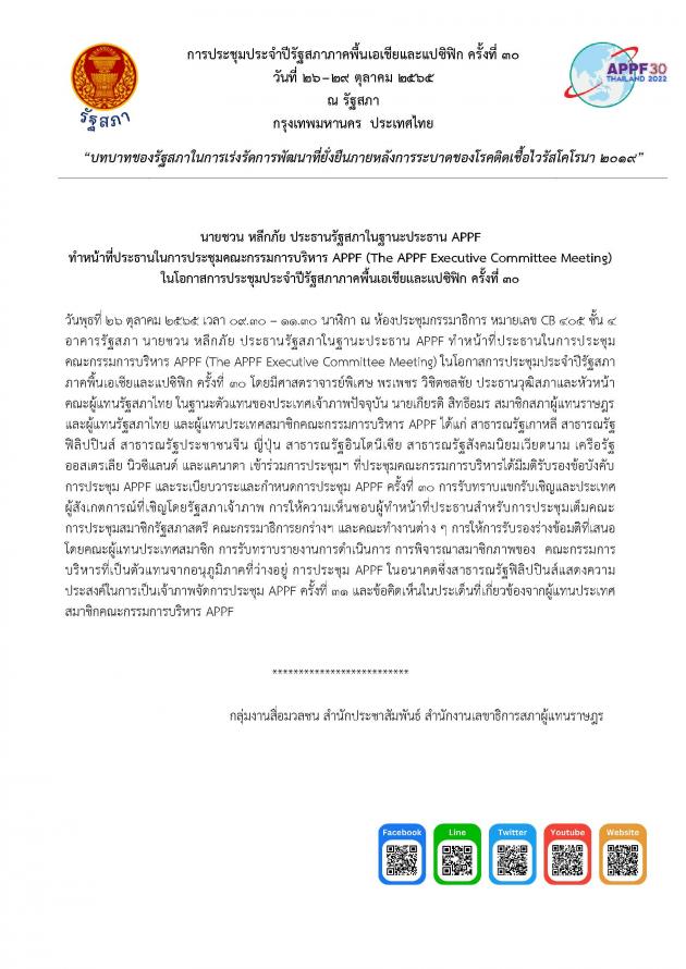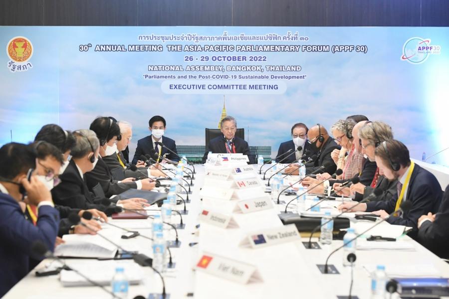 วันพุธที่ 26 ตุลาคม 2565 เวลา 09.30 – 11.30 นาฬิกา ณ ห้องประชุมกรรมาธิการ CB 405 ชั้น 4 อาคารรัฐสภา นายชวน หลีกภัย ประธานรัฐสภา ในฐานะประธาน APPF ทำหน้าที่ประธานในการประชุมคณะกรรมการบริหาร APPF (The APPF Executive Committee Meeting) ในโอกาสการประชุมประจำปีรัฐสภาภาคพื้นเอเชียและแปซิฟิก ครั้งที่ 30