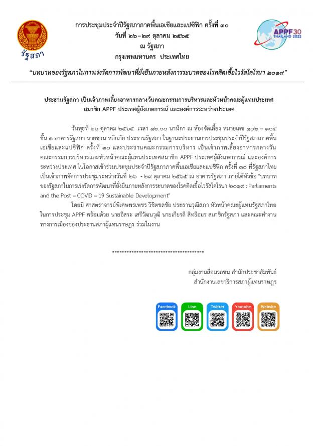 วันพุธที่ 26 ตุลาคม 2565 เวลา 12.00 นาฬิกา ณ ห้องจัดเลี้ยงหมายเลข 102 – 104 ชั้น 1 อาคารรัฐสภา นายชวน หลีกภัย ประธานรัฐสภา ในฐานะประธานการประชุมประจำปีรัฐสภาภาคพื้นเอเชียและแปซิฟิก ครั้งที่ 30 และประธานคณะกรรมการบริหาร เป็นเจ้าภาพเลี้ยงอาหารกลางวันคณะกรรมการบริหารและหัวหน้าคณะผู้แทนประเทศสมาชิก APPF ประเทศผู้สังเกตการณ์ และองค์การระหว่างประเทศ ในโอกาสเข้าร่วมประชุมประจำปีรัฐสภาภาคพื้นเอเชียและแปซิฟิก ครั้งที่ 30 ที่รัฐสภาไทย
