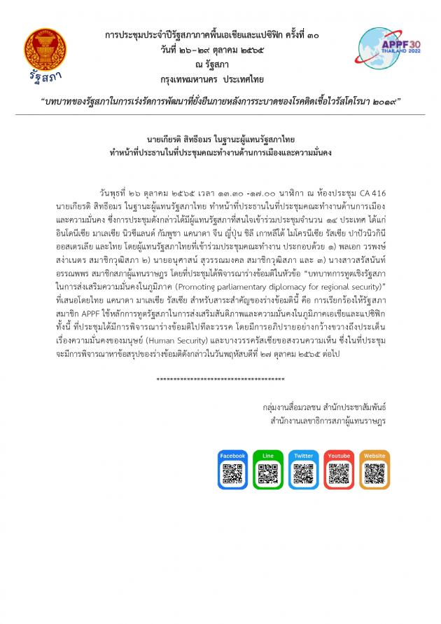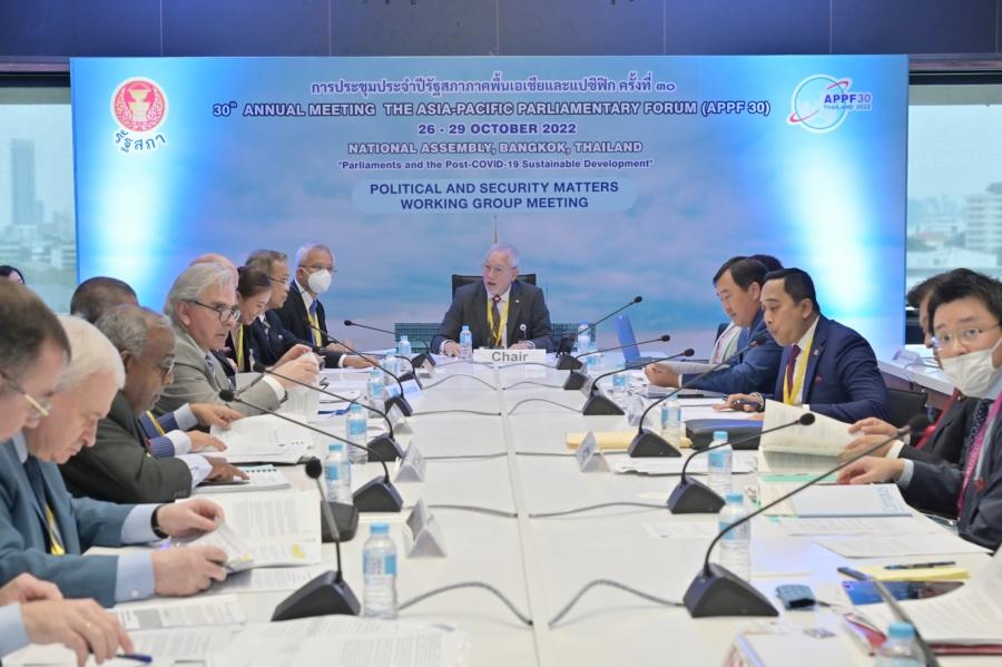 วันพุธที่ 26 ตุลาคม 2565 เวลา 13.30 – 17.00 นาฬิกา ณ ห้องประชุม CA 416 อาคารรัฐสภา  นายเกียรติ สิทธีอมร ในฐานะผู้แทนรัฐสภาไทยทำหน้าที่ประธานในที่ประชุมคณะทำงานด้านการเมือง และความมั่นคง ซึ่งการประชุมดังกล่าวได้มีผู้แทนรัฐสภาที่สนใจเข้าร่วมประชุม จำนวน 14 ประเทศ ได้แก่ อินโดนีเซีย มาเลเซีย นิวซีแลนด์ กัมพูชา แคนาดา จีน ญี่ปุ่น ชิลี เกาหลีใต้ ไมโครนีเซีย รัสเซีย ปาปัวนิวกินี ออสเตรเลีย และไทย