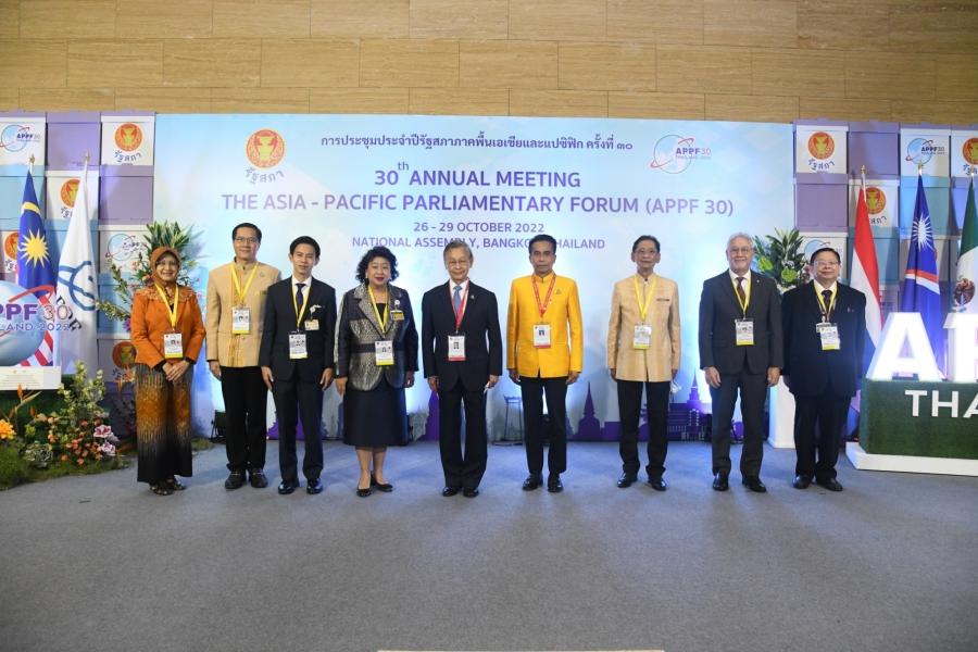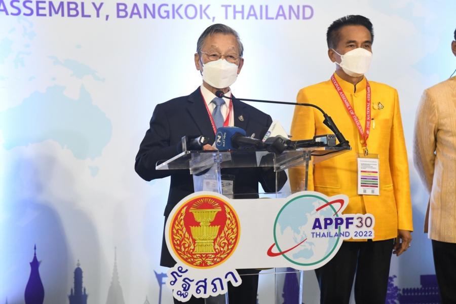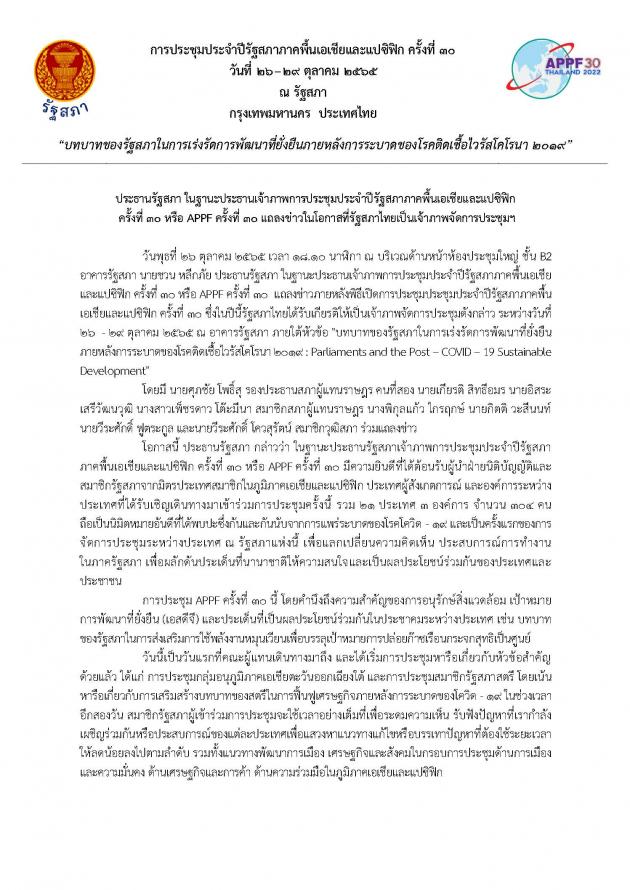 วันพุธที่ 26 ตุลาคม 2565 เวลา 18.10 นาฬิกา ณ บริเวณด้านหน้าห้องประชุมใหญ่ ชั้น B2 อาคารรัฐสภา นายชวน หลีกภัย ประธานรัฐสภา ในฐานะประธานเจ้าภาพการประชุมประจำปีรัฐสภาภาคพื้นเอเชียและแปซิฟิก ครั้งที่ 30หรือ APPF ครั้งที่ 30 แถลงข่าวภายหลังพิธีเปิดการประชุมประชุมประจำปีรัฐสภาภาคพื้นเอเชียและแปซิฟิก ครั้งที่ 30 ซึ่งในปีนี้รัฐสภาไทยได้รับเกียรติให้เป็นเจ้าภาพจัดการประชุมดังกล่าว ระหว่างวันที่ 26  - 29 ต.ค. 65 ณ อาคารรัฐสภา ภายใต้หัวข้อ "บทบาทของรัฐสภาในการเร่งรัดการพัฒนาที่ยั่งยืนภายหลังการระบาดของโรคติดเชื้อไวรัสโคโรนา 2019 : Parliaments and the Post – COVID – 19 Sustainable Development"