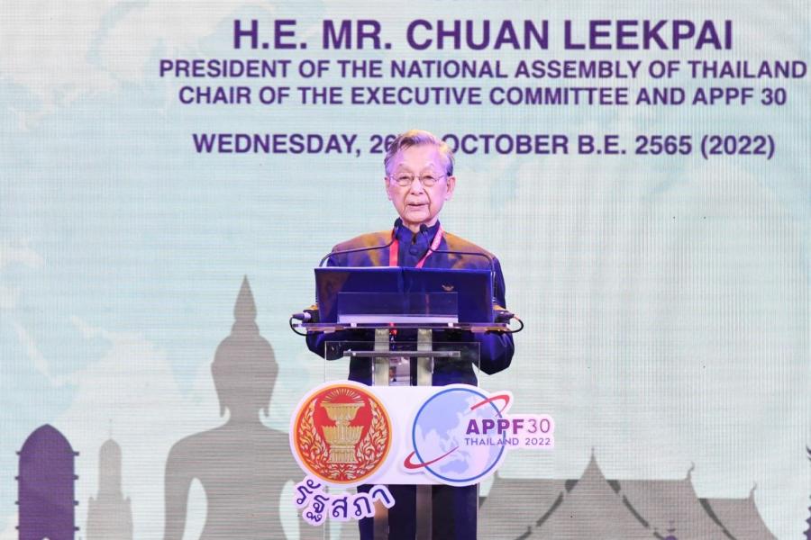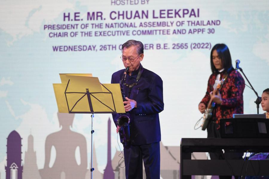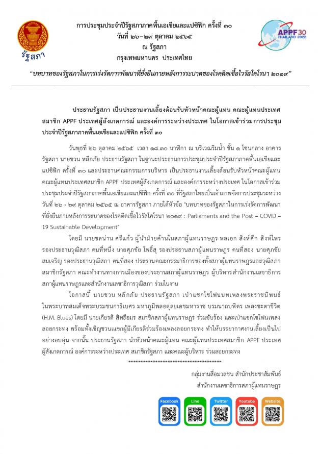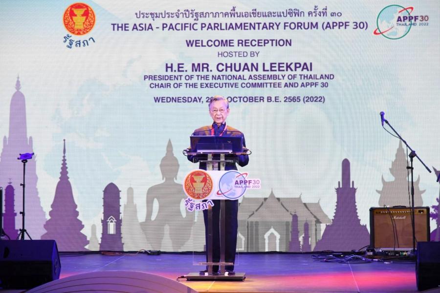 วันพุธที่ 26 ตุลาคม 2565 เวลา 18.30 นาฬิกา ณ บริเวณริมน้ำ ชั้น 1 โซนกลาง อาคารรัฐสภา นายชวน หลีกภัยประธานรัฐสภา เป็นประธานงานเลี้ยงต้อนรับหัวหน้าคณะผู้แทน คณะผู้แทนประเทศสมาชิก APPF ประเทศผู้สังเกตการณ์ และองค์การระหว่างประเทศ ในโอกาสเข้าร่วมประชุมการประจำปีรัฐสภาภาคพื้นเอเชียและแปซิฟิก ครั้งที่ 30